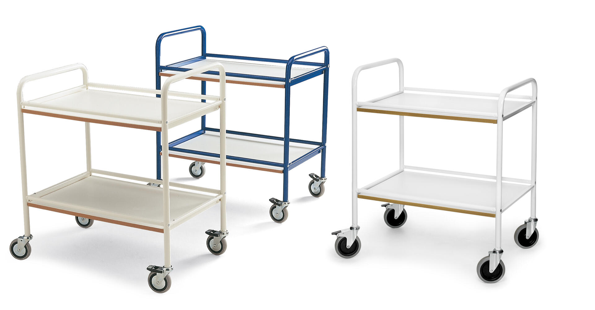 Stadig, tålig och lätt att hålla ren. Mått vagn: B76xD52xH83 cm. Avståndet mellan hyllplanen är 37 cm. Vikt 20 kg. Max belastning 100 kg. 2 låsbara hjul. Stomme av vitlackerade stålrör och skivor i ljuddämpande linoleum.
