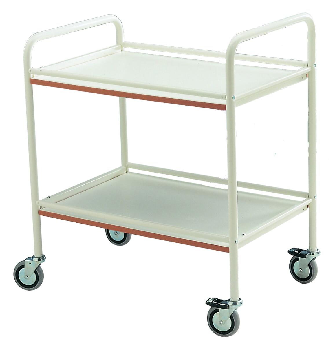 Förvarings- och serveringsvagn med 2 hyllplan. 4 st länkhjul varav 2 st låsbara, diameter 12,5 cm. Mått hyllplan: L90xB44 cm. Mått hel vagn: L108xB48xH94 cm, vikt: 23 kg. Maxbelastning 250 kg. Pulverlackad eller förzinkad plåt.