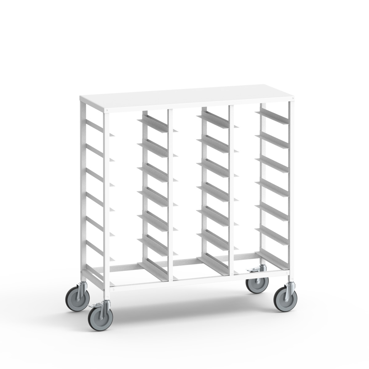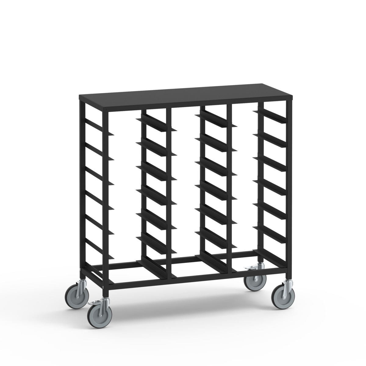 Förvaringsvagn med plats för 14 brickor eller backar. Välj mellan att köpa endast vagn, vagn med backar eller vagn med brickor. Förvaringsvagn i metall med hjul, varav två är låsbara. Montering av hjul, gärna med låsbara på varsin kortsida.