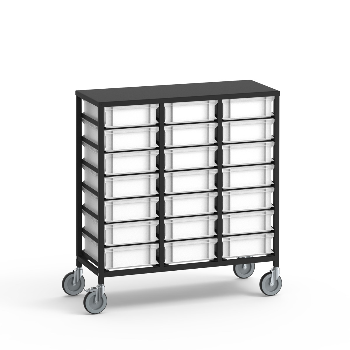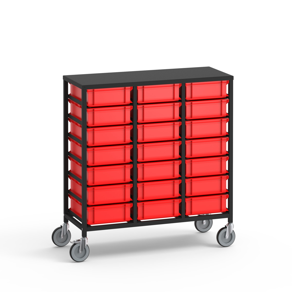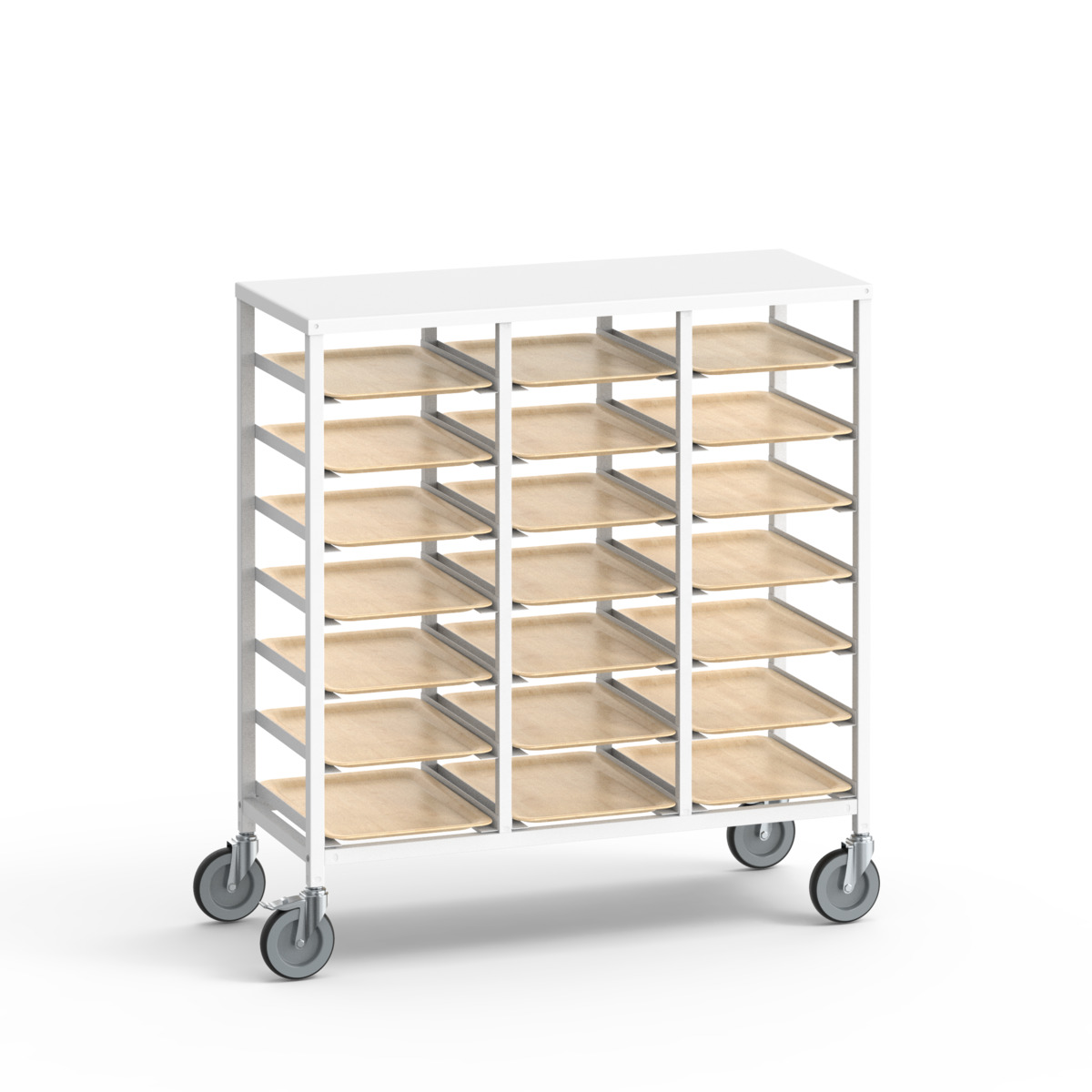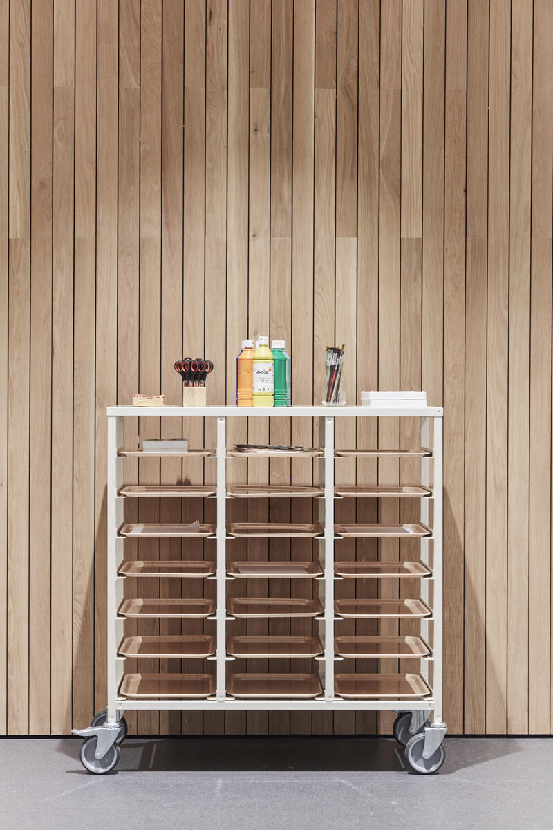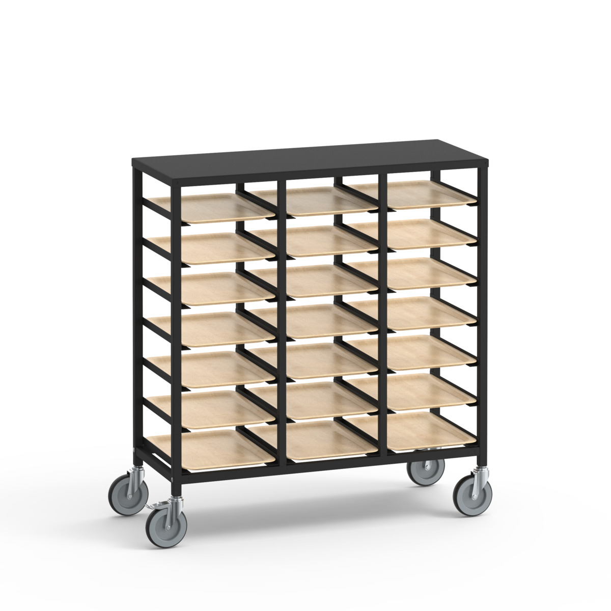 Förvaringsvagn med plats för 21 brickor eller backar. Välj mellan att köpa endast vagn, vagn med backar eller vagn med brickor. Förvaringsvagn i metall med hjul, varav två är låsbara. Montering av hjul, gärna med låsbara på varsin kortsida.