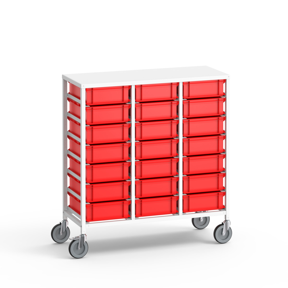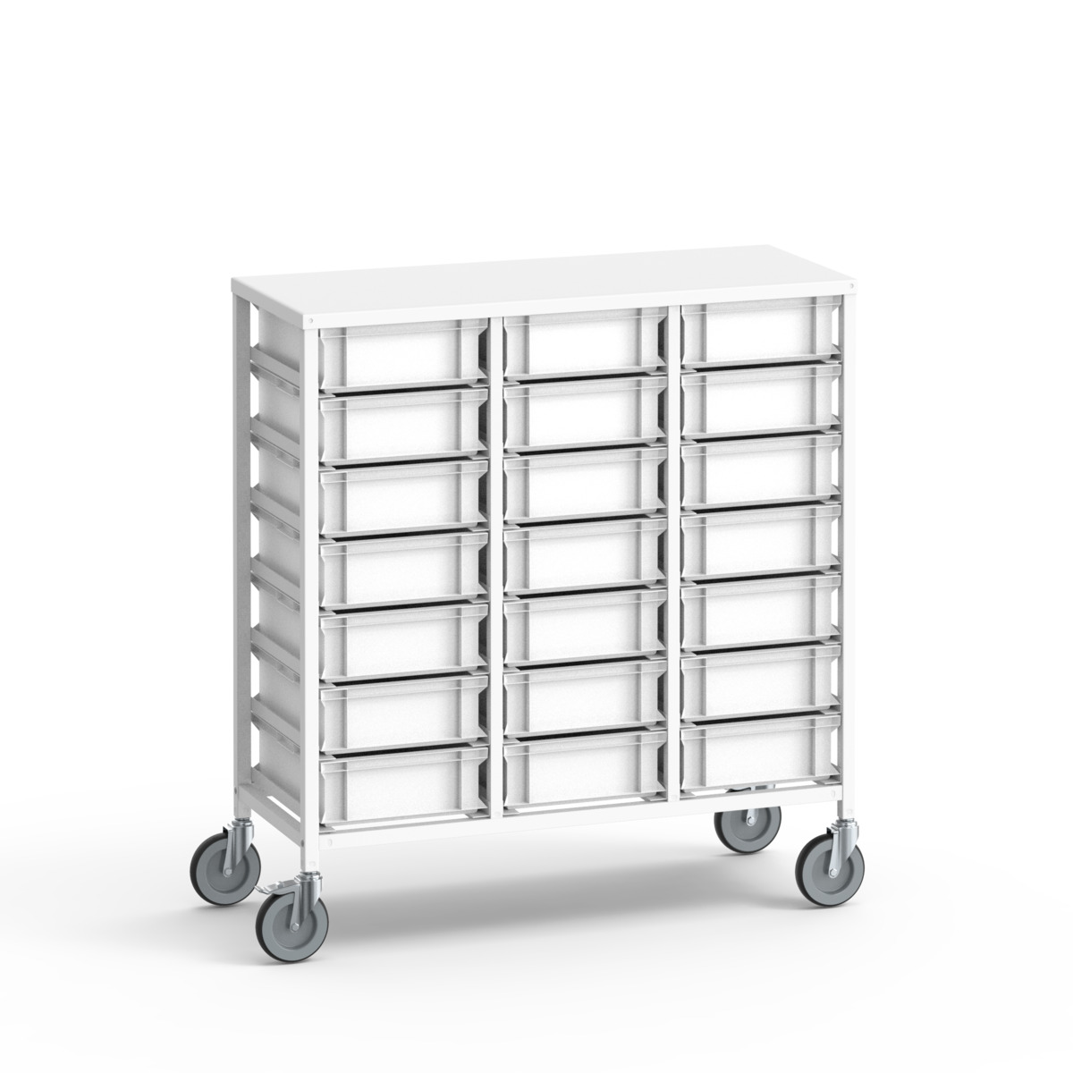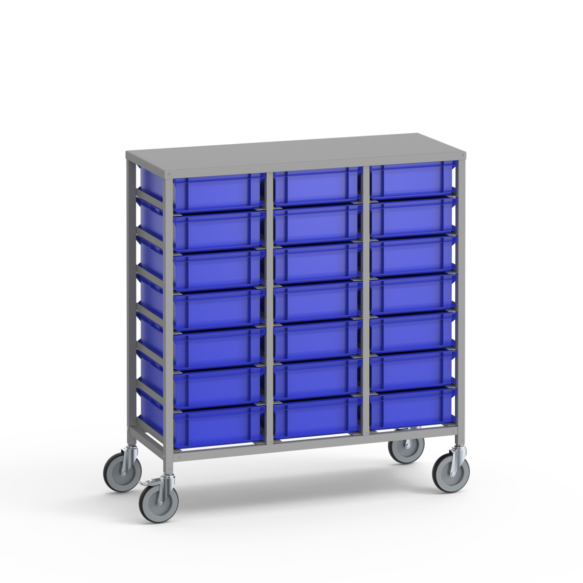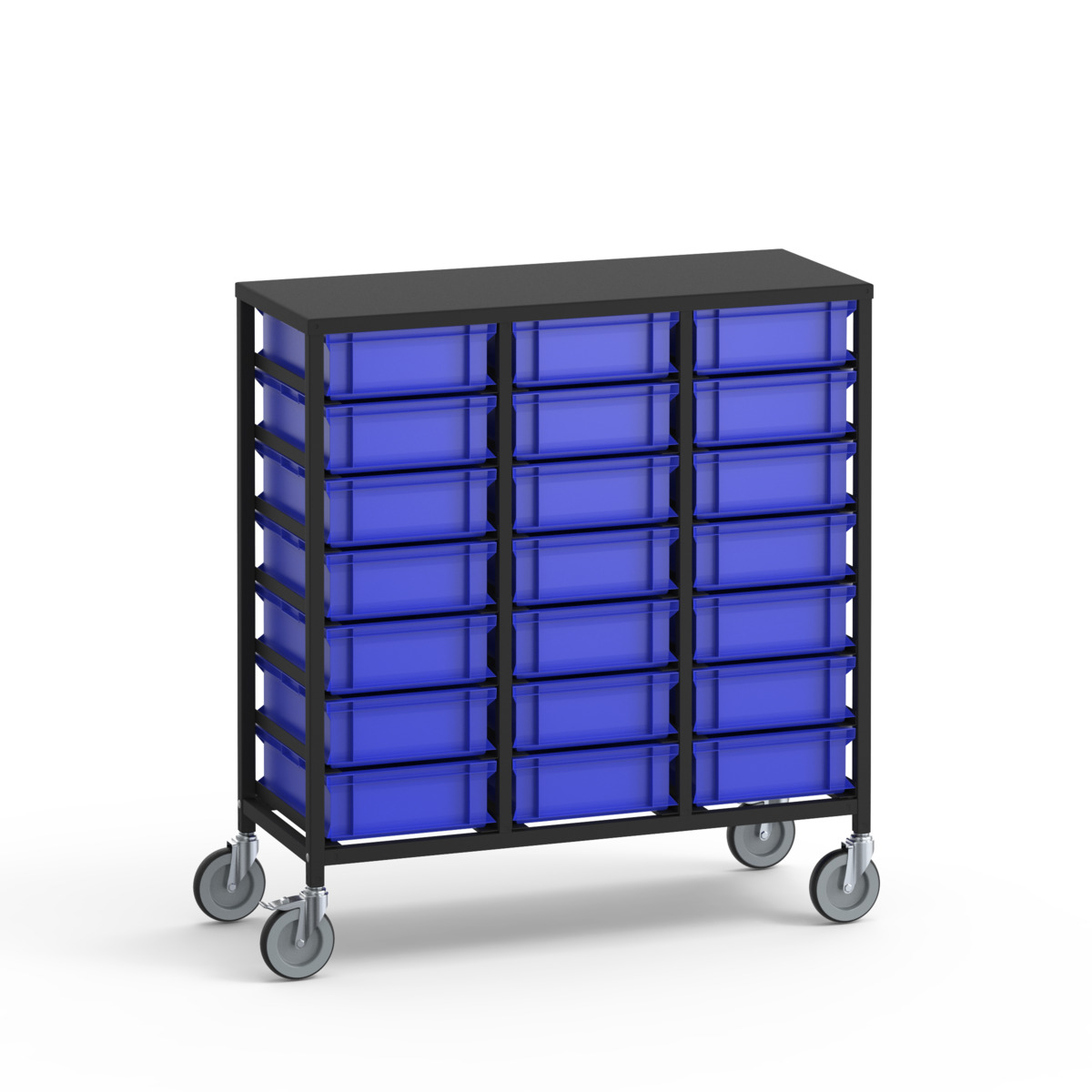Förvaringsvagn med plats för 21 brickor eller backar. Välj mellan att köpa endast vagn, vagn med backar eller vagn med brickor. Förvaringsvagn i metall med hjul, varav två är låsbara. Montering av hjul, gärna med låsbara på varsin kortsida.