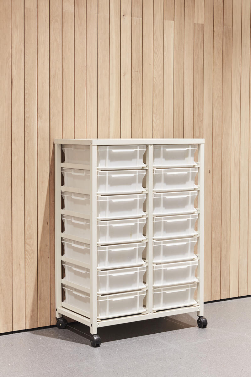 Förvaringsvagn med plats för 21 brickor eller backar. Välj mellan att köpa endast vagn, vagn med backar eller vagn med brickor. Förvaringsvagn i metall med hjul, varav två är låsbara. Montering av hjul, gärna med låsbara på varsin kortsida.