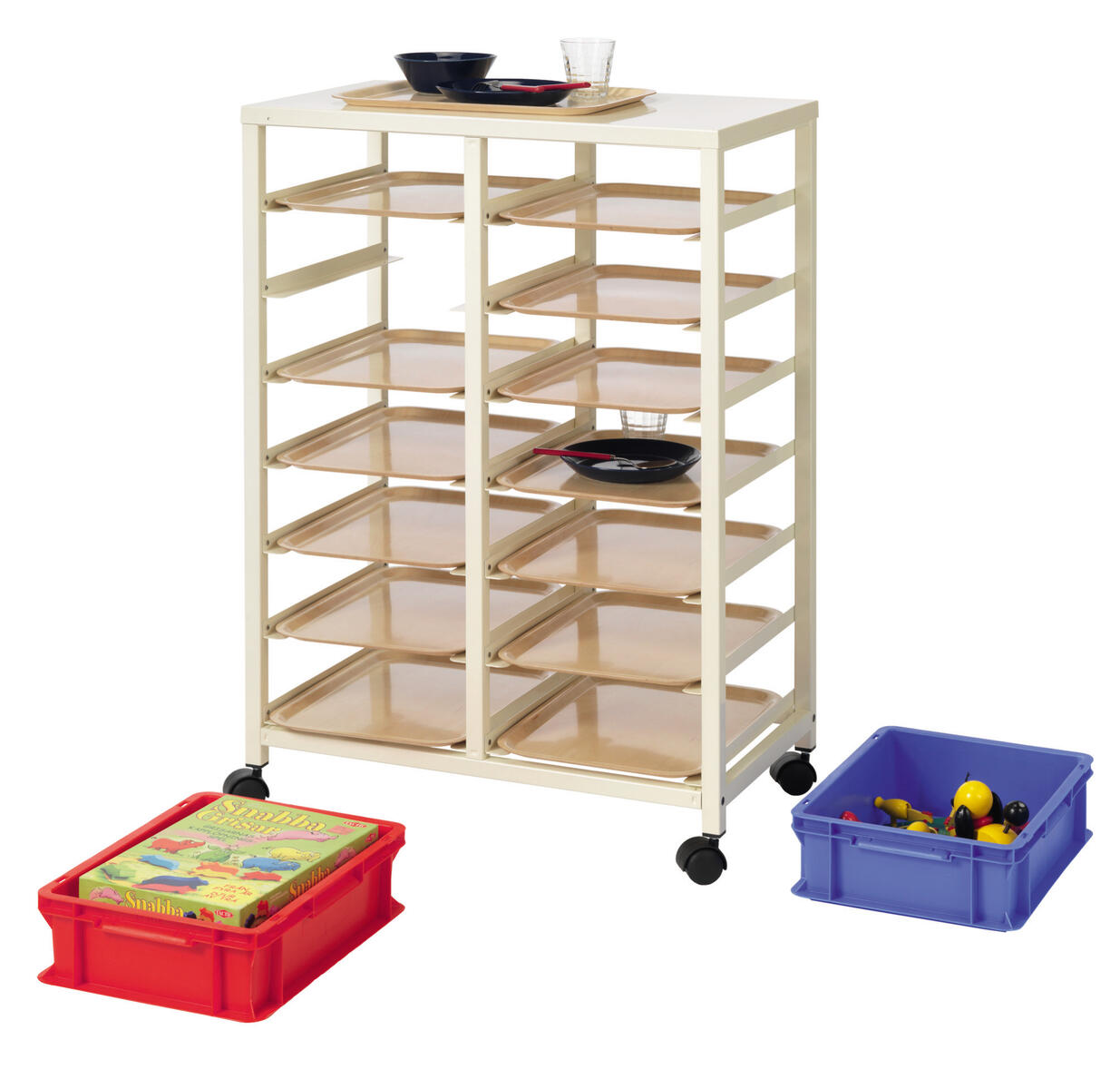 Förvaringsvagn med plats för 21 brickor eller backar. Välj mellan att köpa endast vagn, vagn med backar eller vagn med brickor. Förvaringsvagn i metall med hjul, varav två är låsbara. Montering av hjul, gärna med låsbara på varsin kortsida.