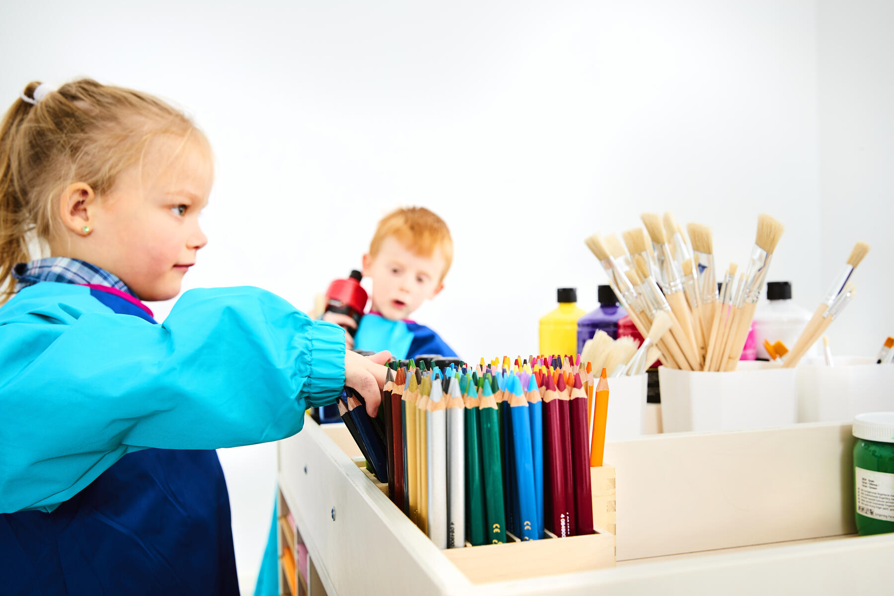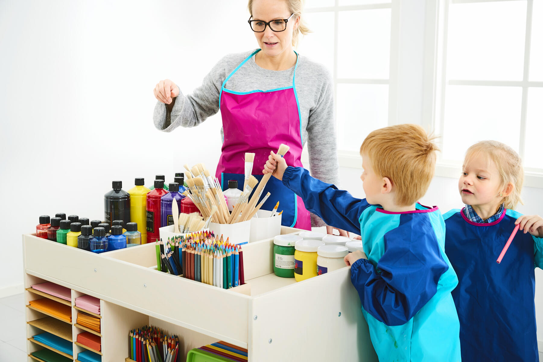 Förvaringsvagn med material för kreativt skapande. Innehåller: gladkartong A3 i fem olika färger (20 ark/färg), gladkartong A4 i fem olika färger (100 ark/färg), hexagonala färgpennor 144-pack, fiberpennor broad 48 st, syntetpenslar runda mix 25 st, färgkoppar 8 st, hobbyfärg 250 ml 10 st, vänstersax 2 st, saxställ med 12 saxar, mönstersaxar 4 st, limstift 21 g 12 st, konfettilim 6 st, stansformar 4 st, träpinnar 500 st, trähjärtan 100 st, självhäftande ögon på rulle, piprensare 80 st, paljettmix 250 g, velourfigurer 500 st, rörpärlor 5 000 st, pärlplattor 15 st, plastaskar 6 st och pennfack 2 st.