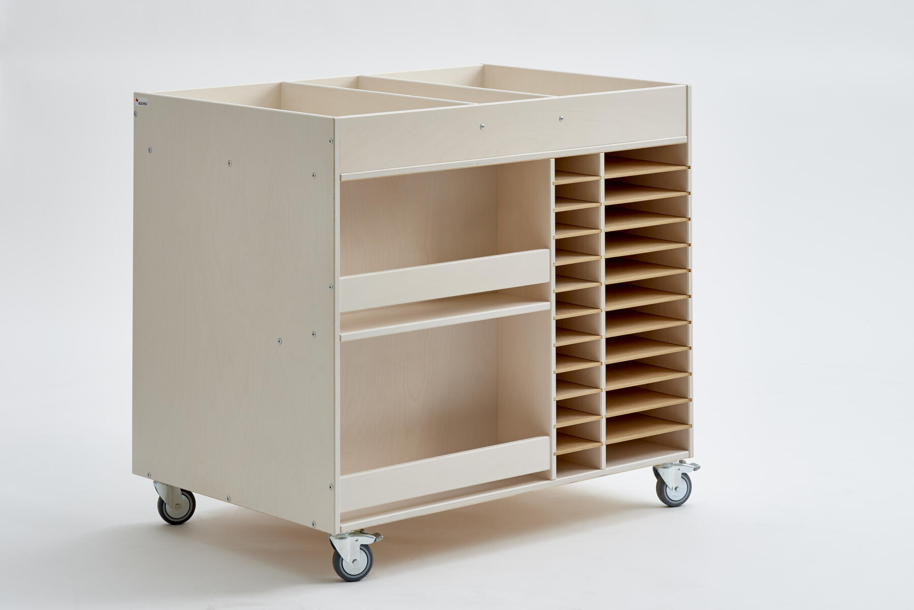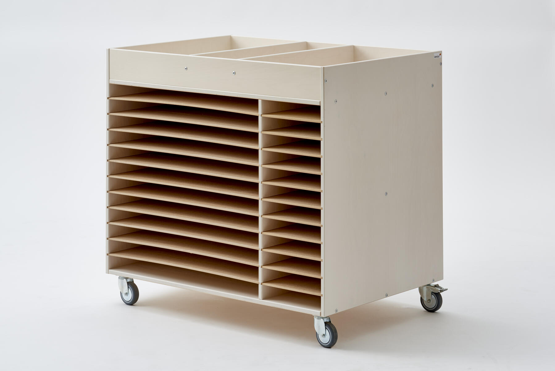 På hjul. Utdragbara hyllor med plats för papper i olika storlekar upp till A2. Låsbara luckor. Plats för plastbackar m.m. Mått: 120x40x72 cm. Klarlackad björkplywood.