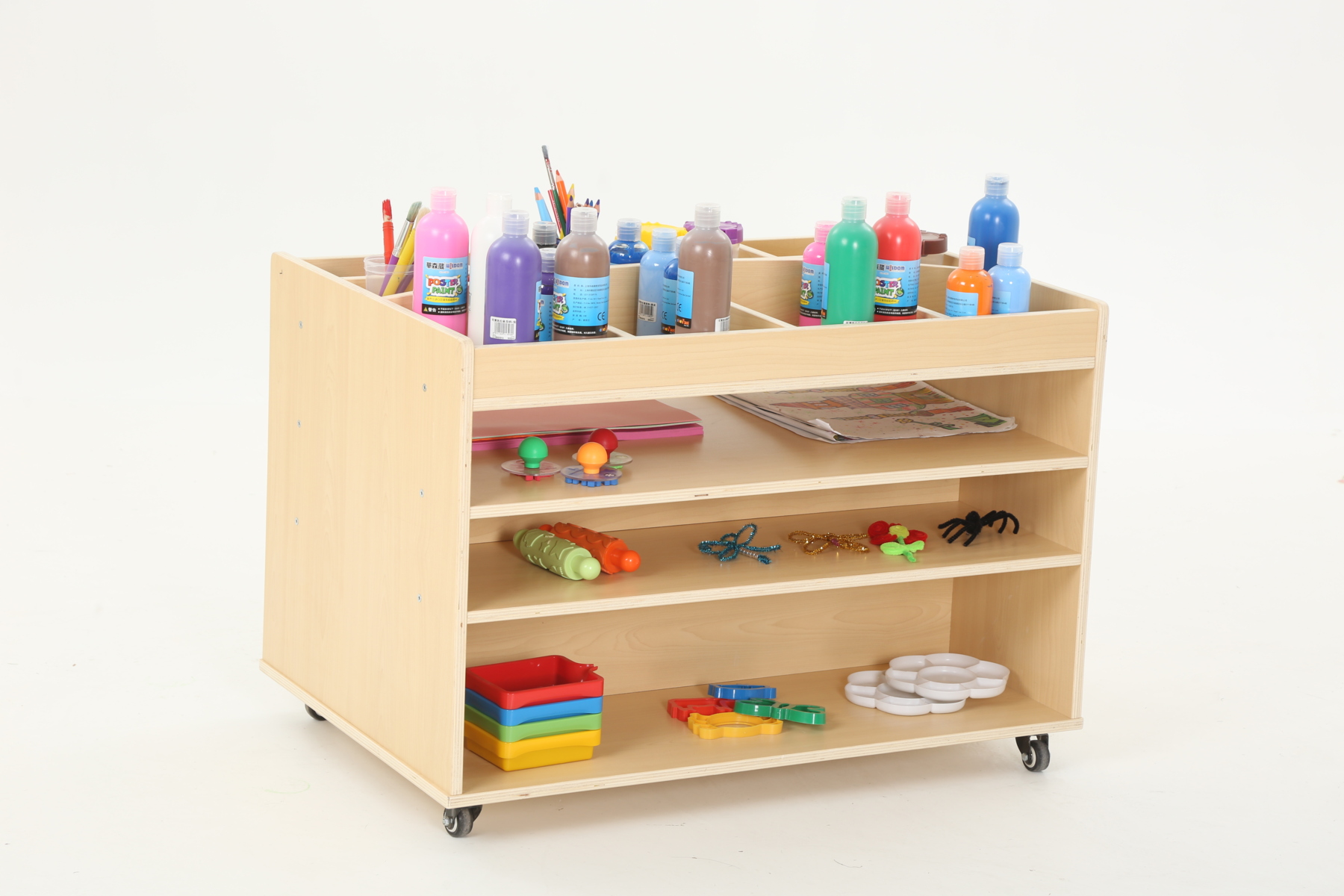 Praktisk och stabil förvaringsvagn med låsbara hjul. Fackindelad med plats för A2-, A4- och A6-papper m.m. 11 st hyllplan. Vitpigmenterad björkplywood. Mått: 93x64x88 cm.