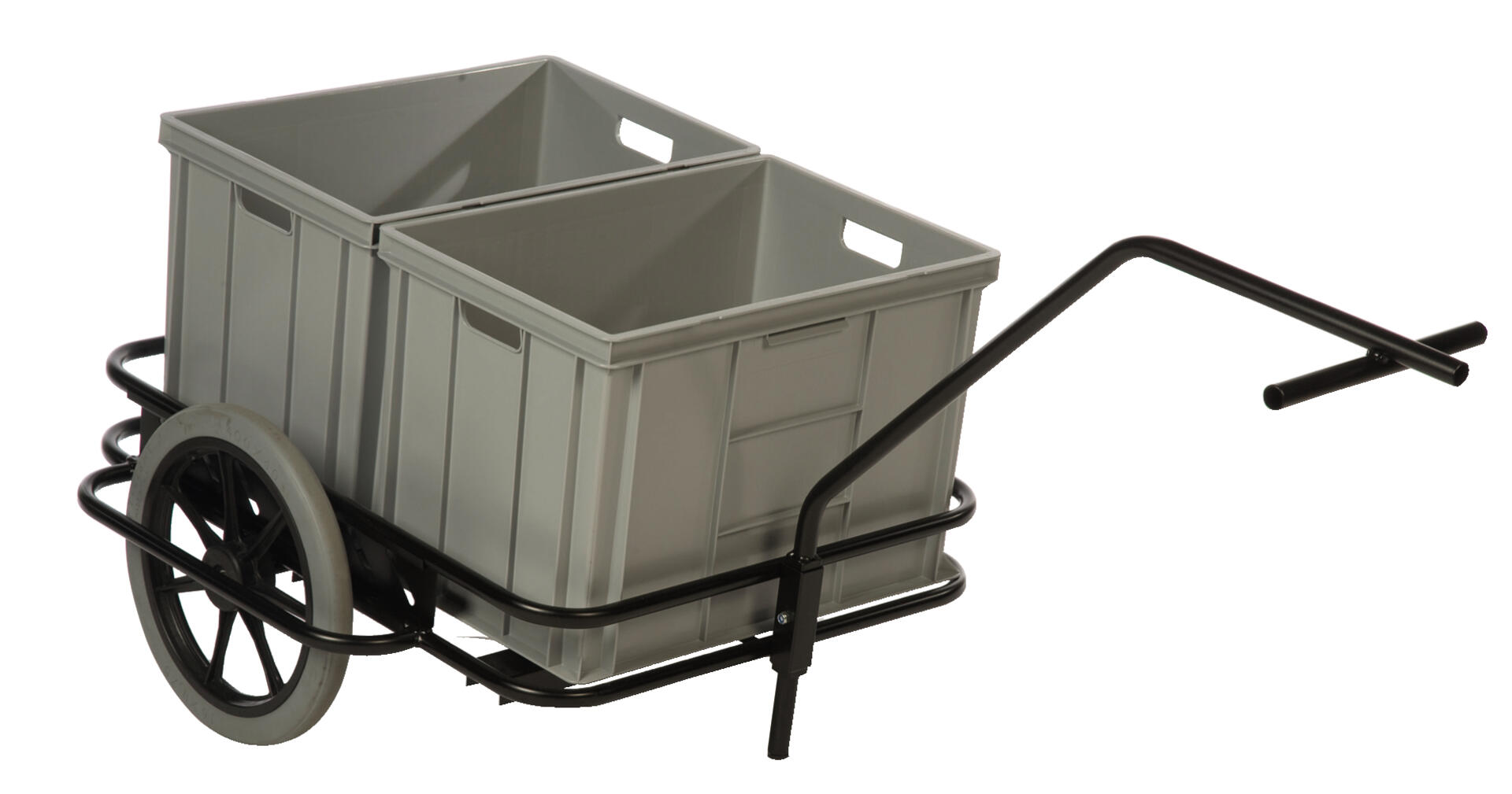 Dragkärra med svartlackerat metallstativ och punkteringsfria hjul. Mått invändigt L82xB65H10 cm. Mått dragkärra: L160xB91xH90 cm. Vikt 23 kg. Klarar 150 kg belastning. (Plastbackar ingår inte.)