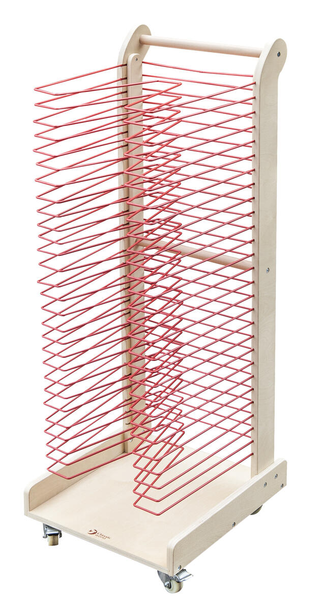 Mobil torkställning med 30 hyllor i metall. För material upp till A3-format. Låsbara hjul. Mått: 42,5x48x121 cm. Levereras omonterad. Monteringsanvisning medföljer. Tillverkad av lackad björk. FSC-märkt. PVC-fri.