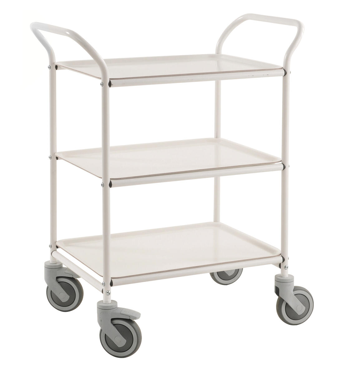 Stadig, tålig och lätt att hålla ren. Mått vagn: B76xD52xH83 cm. Avståndet mellan hyllplanen är 37 cm. Vikt 20 kg. Max belastning 100 kg. 2 låsbara hjul. Stomme av vitlackerade stålrör och skivor i ljuddämpande linoleum.