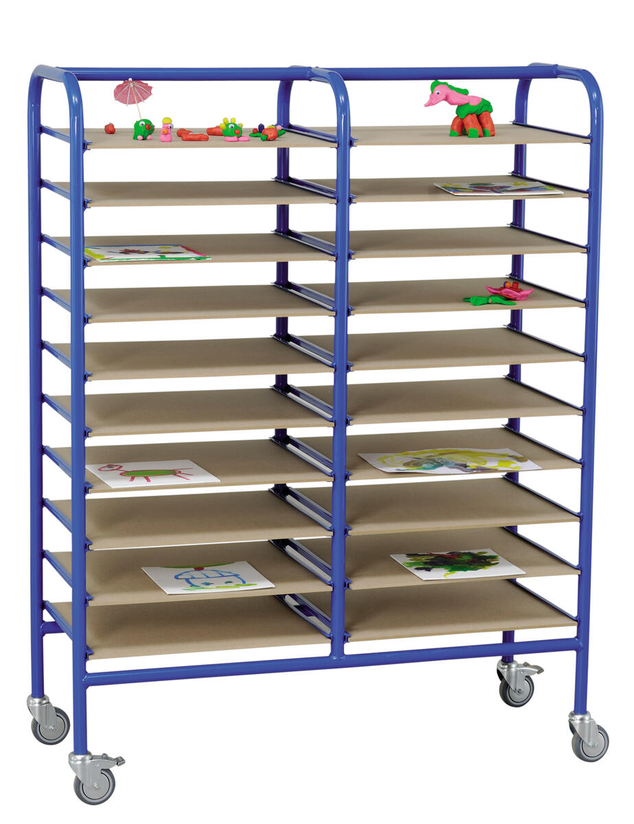 Mobil torkställning med 30 hyllor i metall. För material upp till A3-format. Låsbara hjul. Mått: 42,5x48x121 cm. Levereras omonterad. Monteringsanvisning medföljer. Tillverkad av lackad björk. FSC-märkt. PVC-fri.