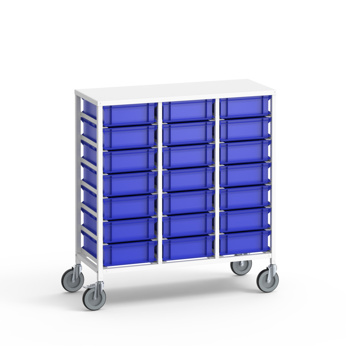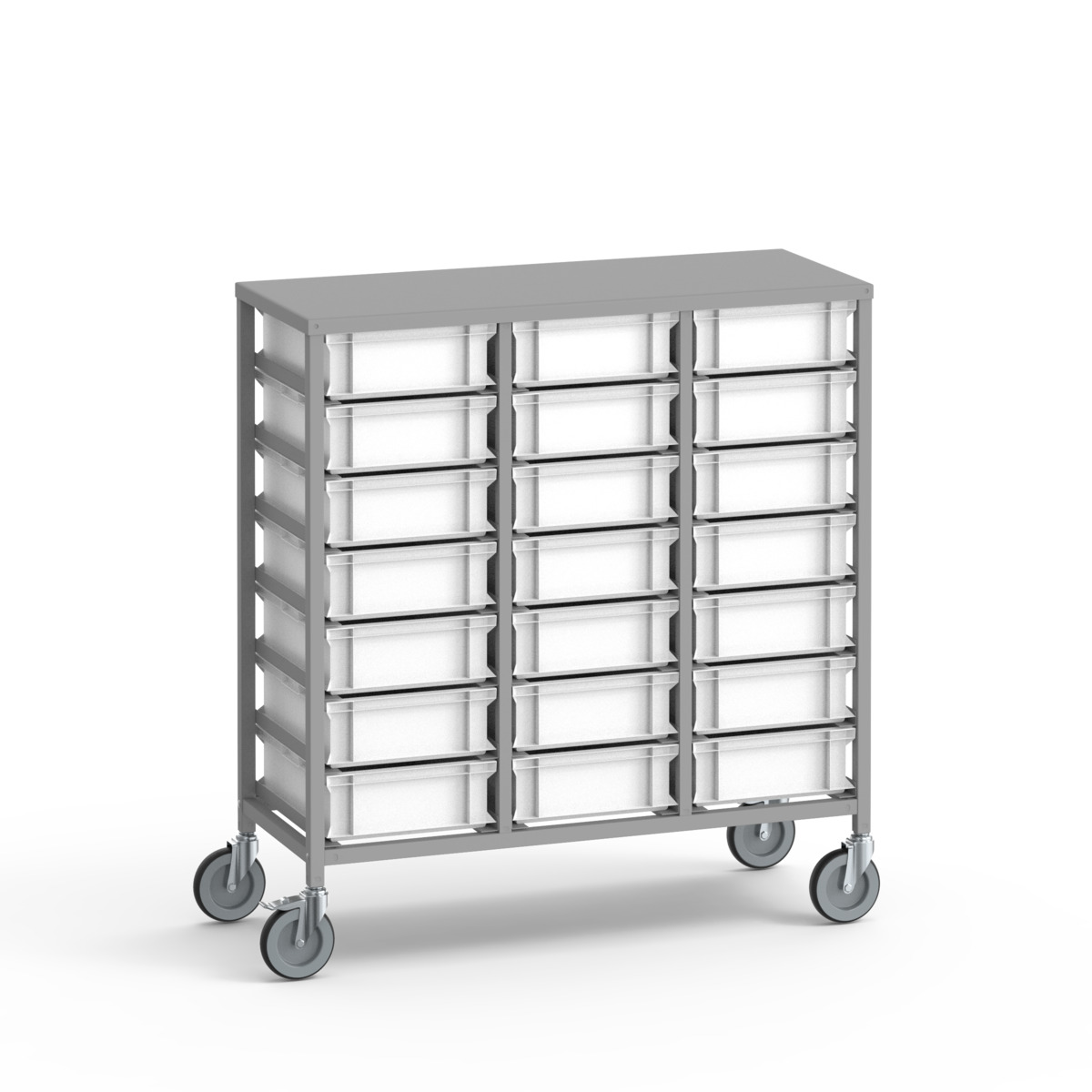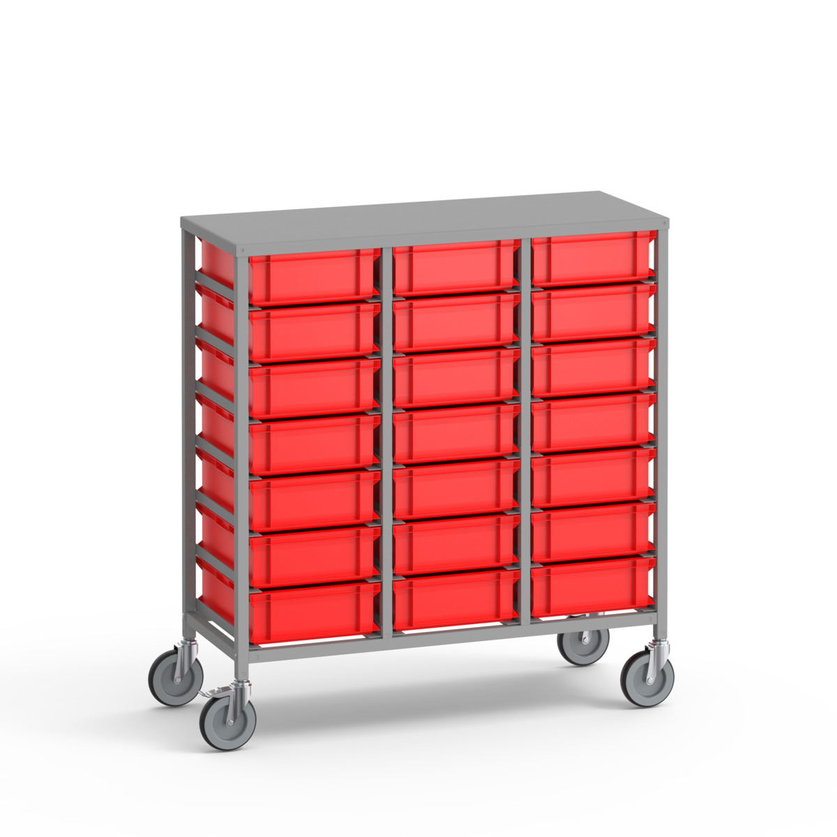 Förvaringsvagn med plats för 21 brickor eller backar. Välj mellan att köpa endast vagn, vagn med backar eller vagn med brickor. Förvaringsvagn i metall med hjul, varav två är låsbara. Montering av hjul, gärna med låsbara på varsin kortsida.