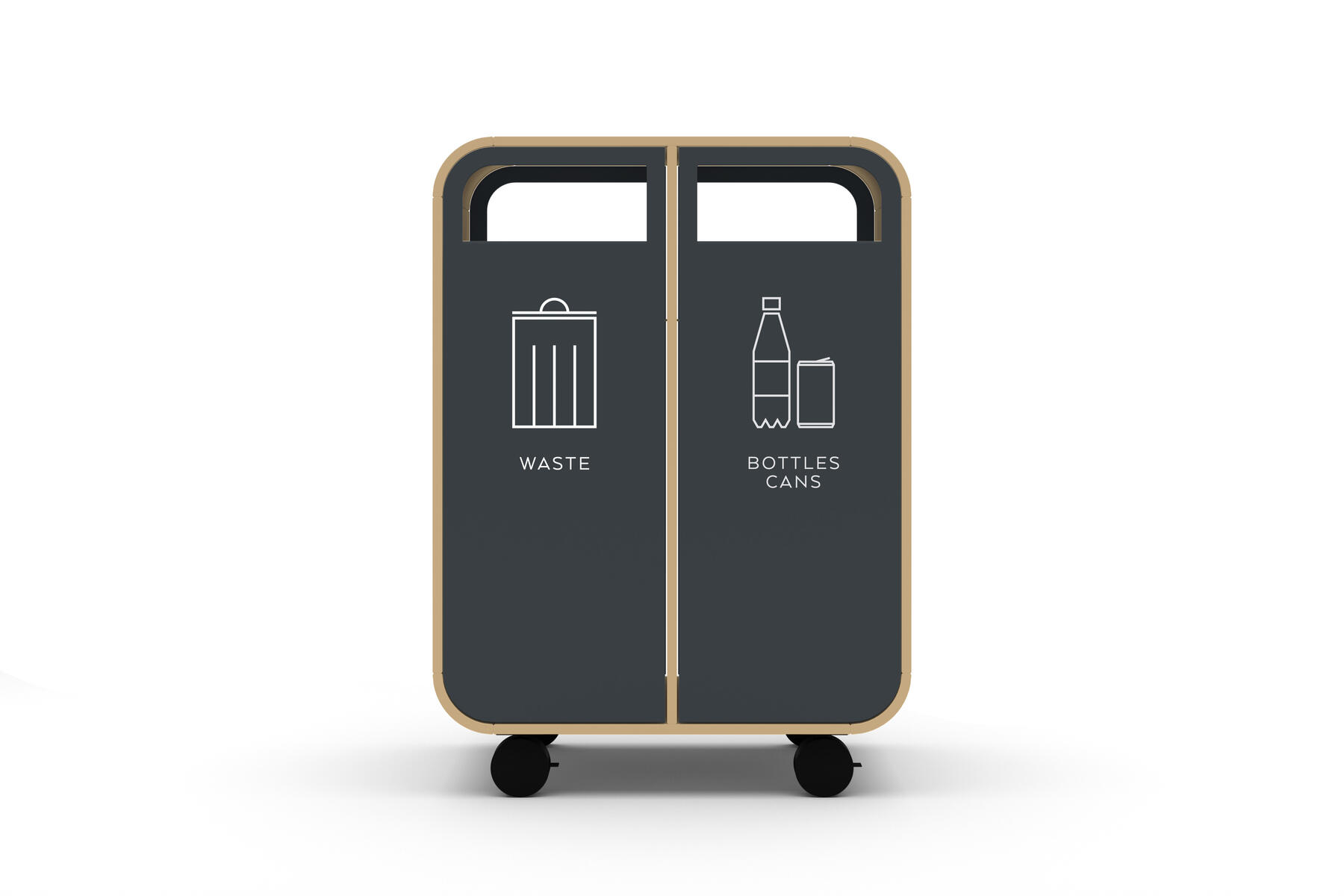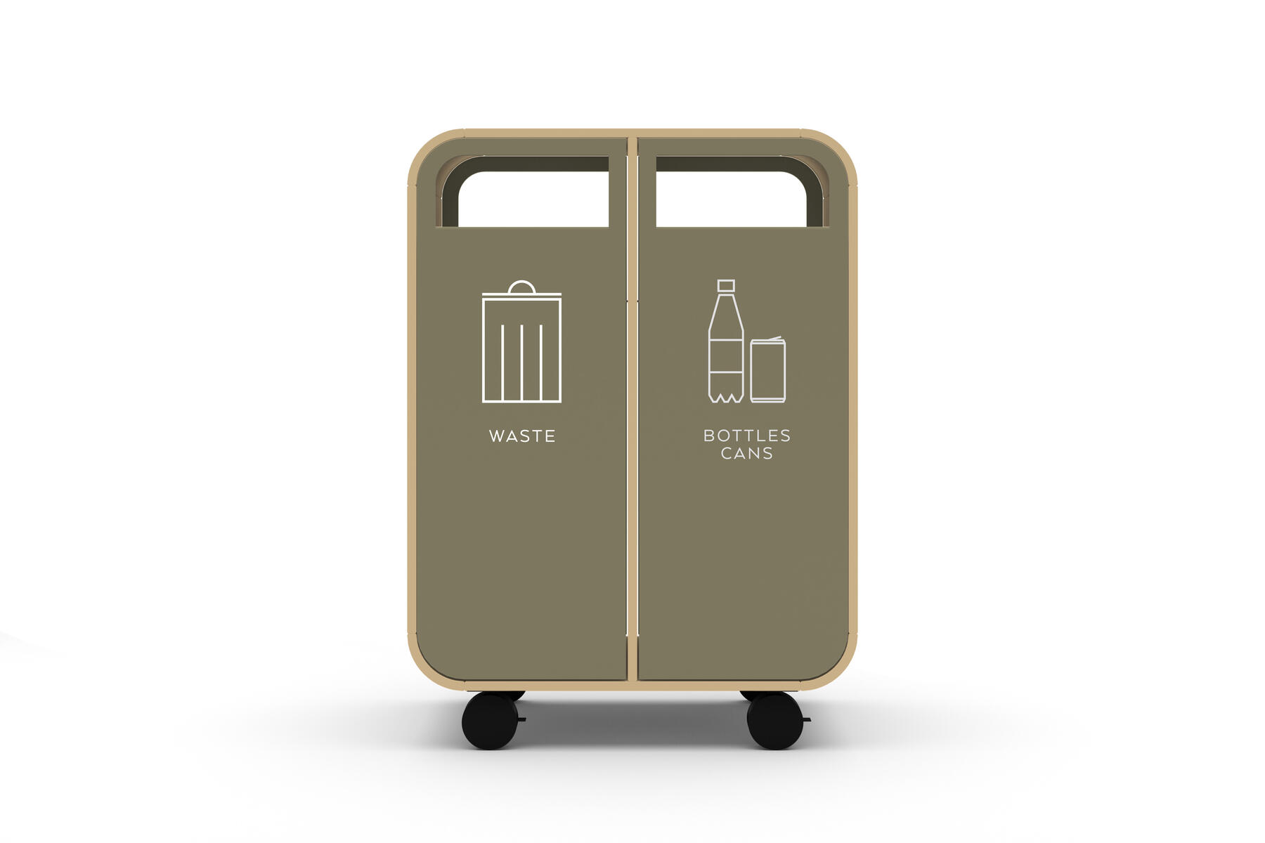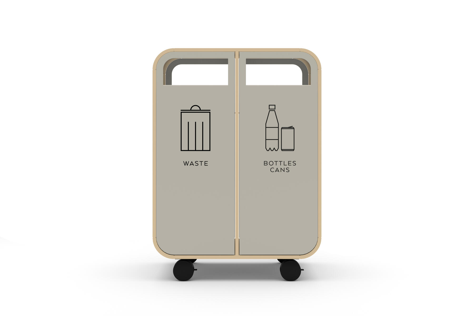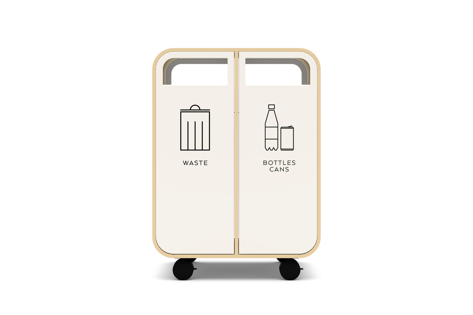 Mobil källsortering i laminat med fyra hjul varav två låsbara. Soft close med magnet i varje dörr. Säckhållare och gummimatta ingår. Välj färg på dörrar. Dörr i metall (3 mm tjocklek). Symboler waste och bottles cans. Passande sopsäckar 85-125 liter.