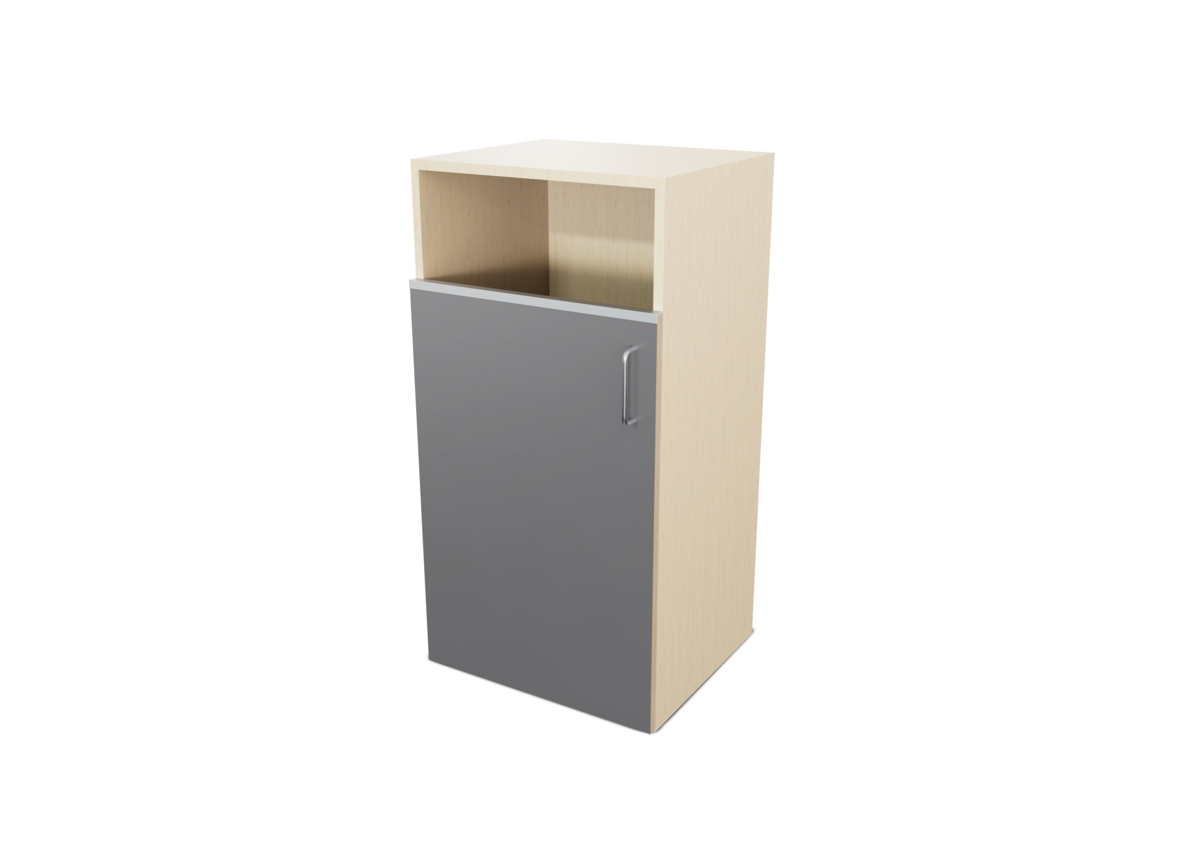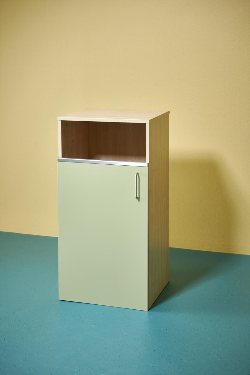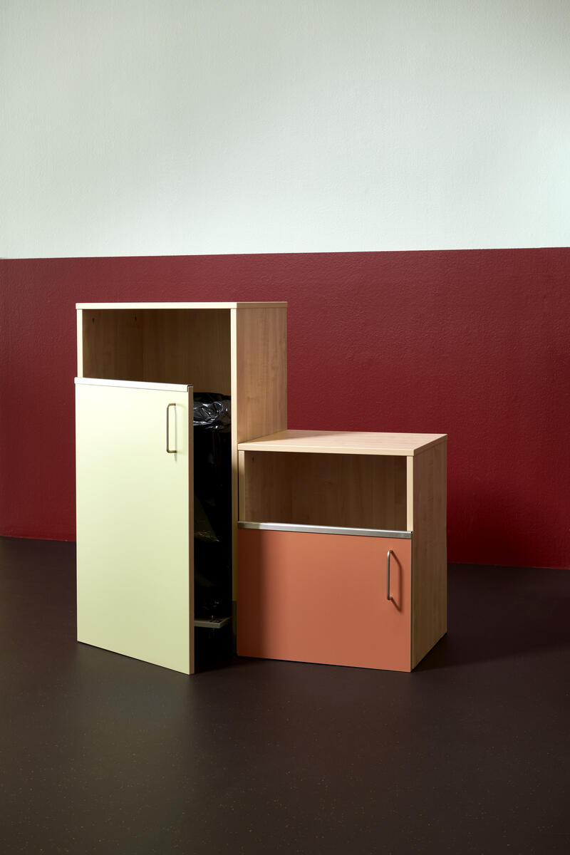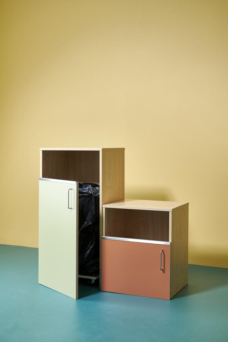 Miljöstation i laminat med dörr och handtag. Topplatta på stomme med hål i för avfall. Hålet har ø 20 cm. Välj mellan laminat och högtryckslaminat på dörr.