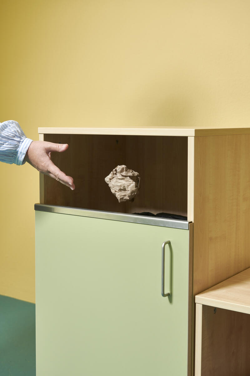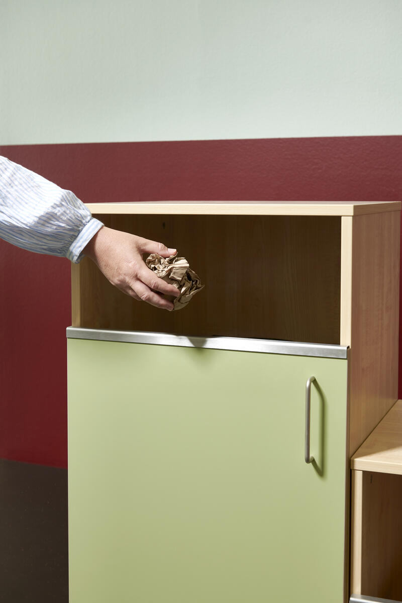 Miljöstation i laminat med dörr och handtag. 22 cm öppning fram på stomme för avfall. Välj mellan laminat och högtryckslaminat på dörr. Köp till en tunna/hink som är 35-37 cm hög.