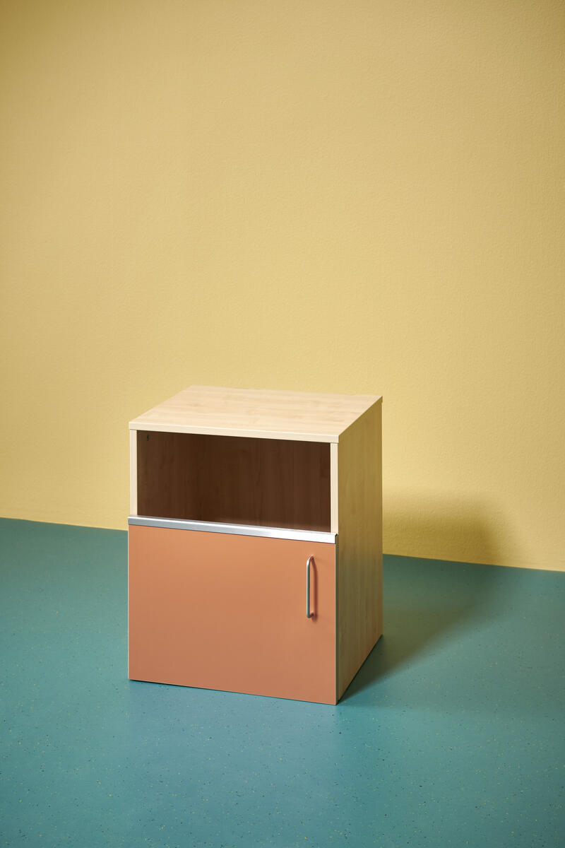 Miljöstation i laminat med dörr och handtag. Topplatta på stomme med hål i för avfall. Hålet har ø 20 cm. Välj mellan laminat och högtryckslaminat på dörr.