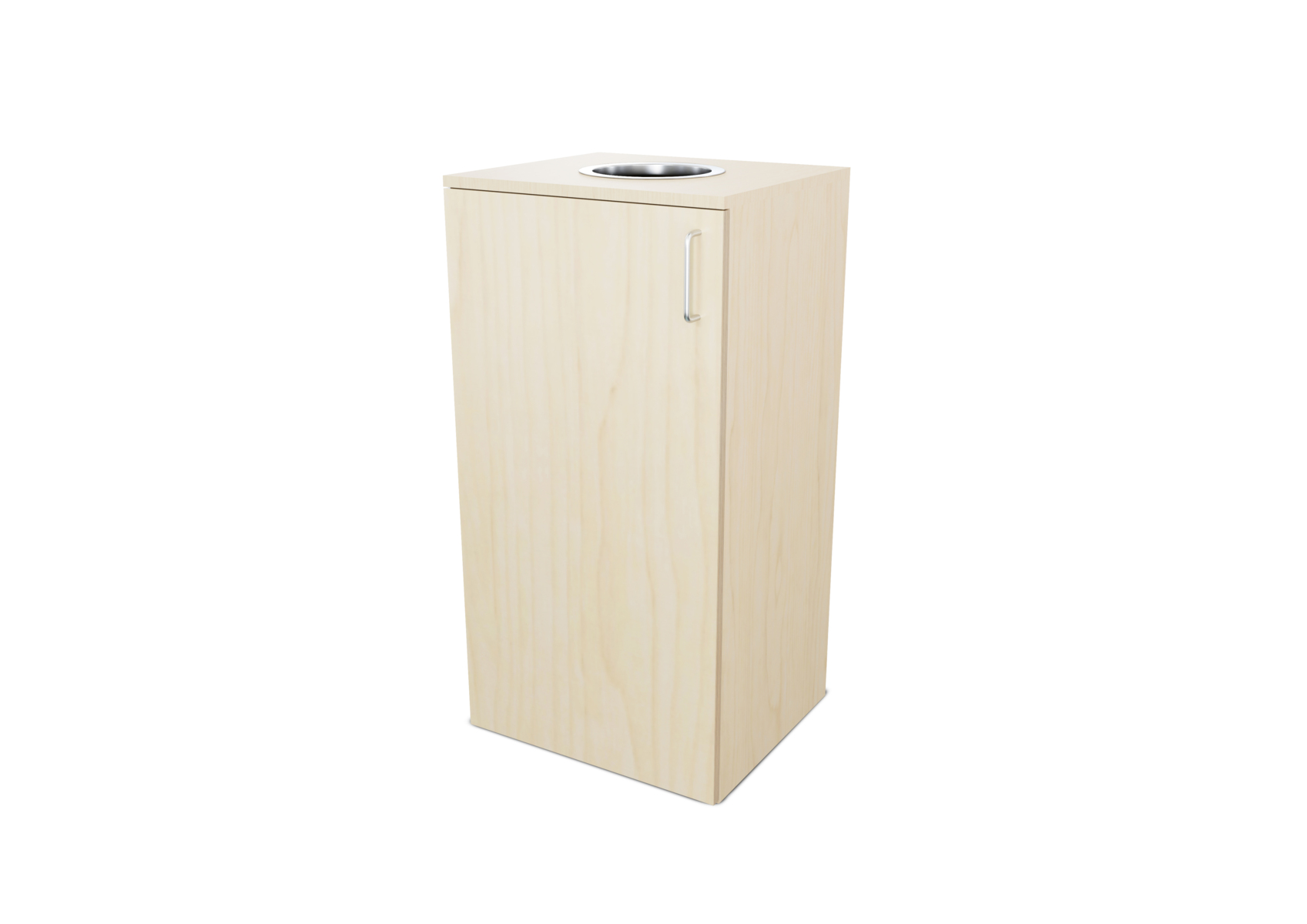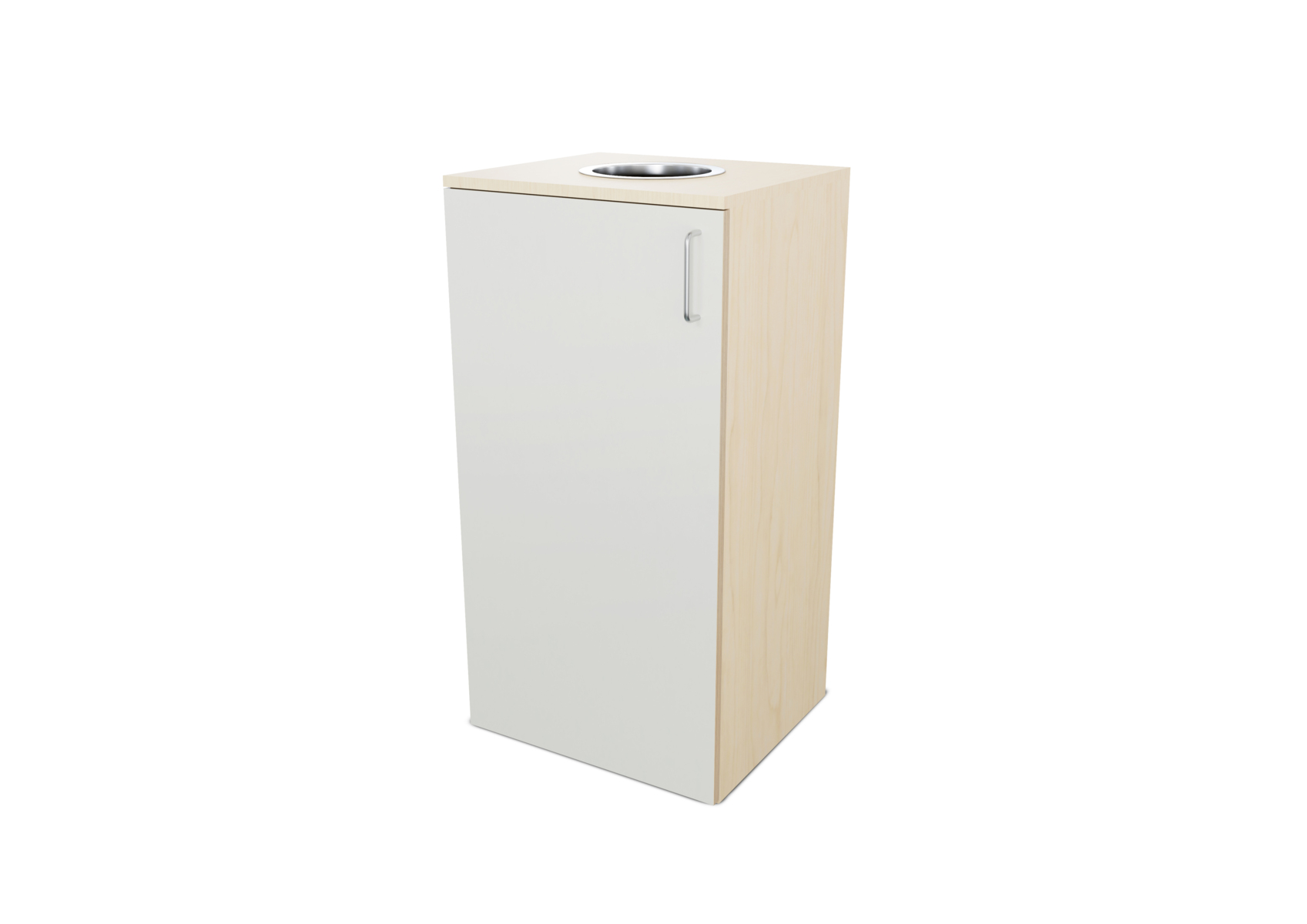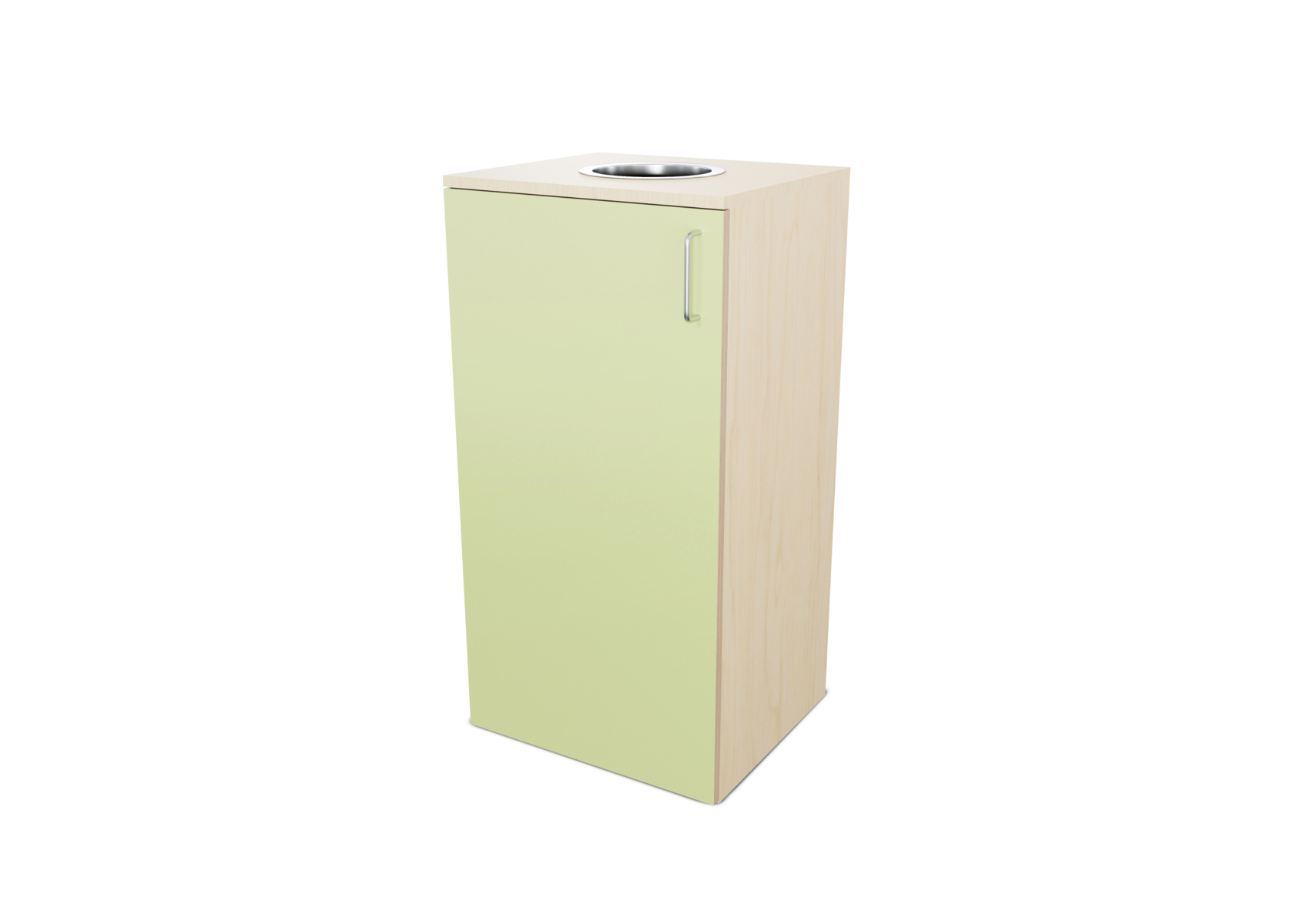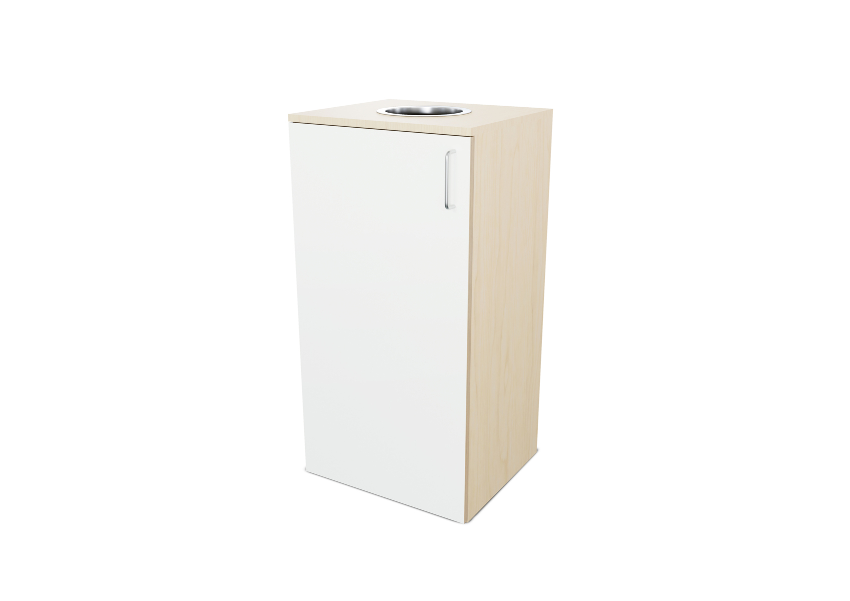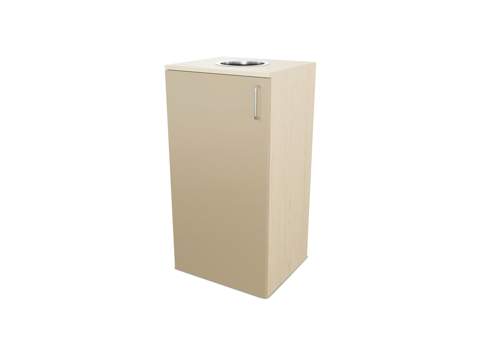 Miljöstation i laminat med dörr och handtag. Topplatta på stomme med hål i för avfall. Hålet har ø 20 cm. Välj mellan laminat och högtryckslaminat på dörr.