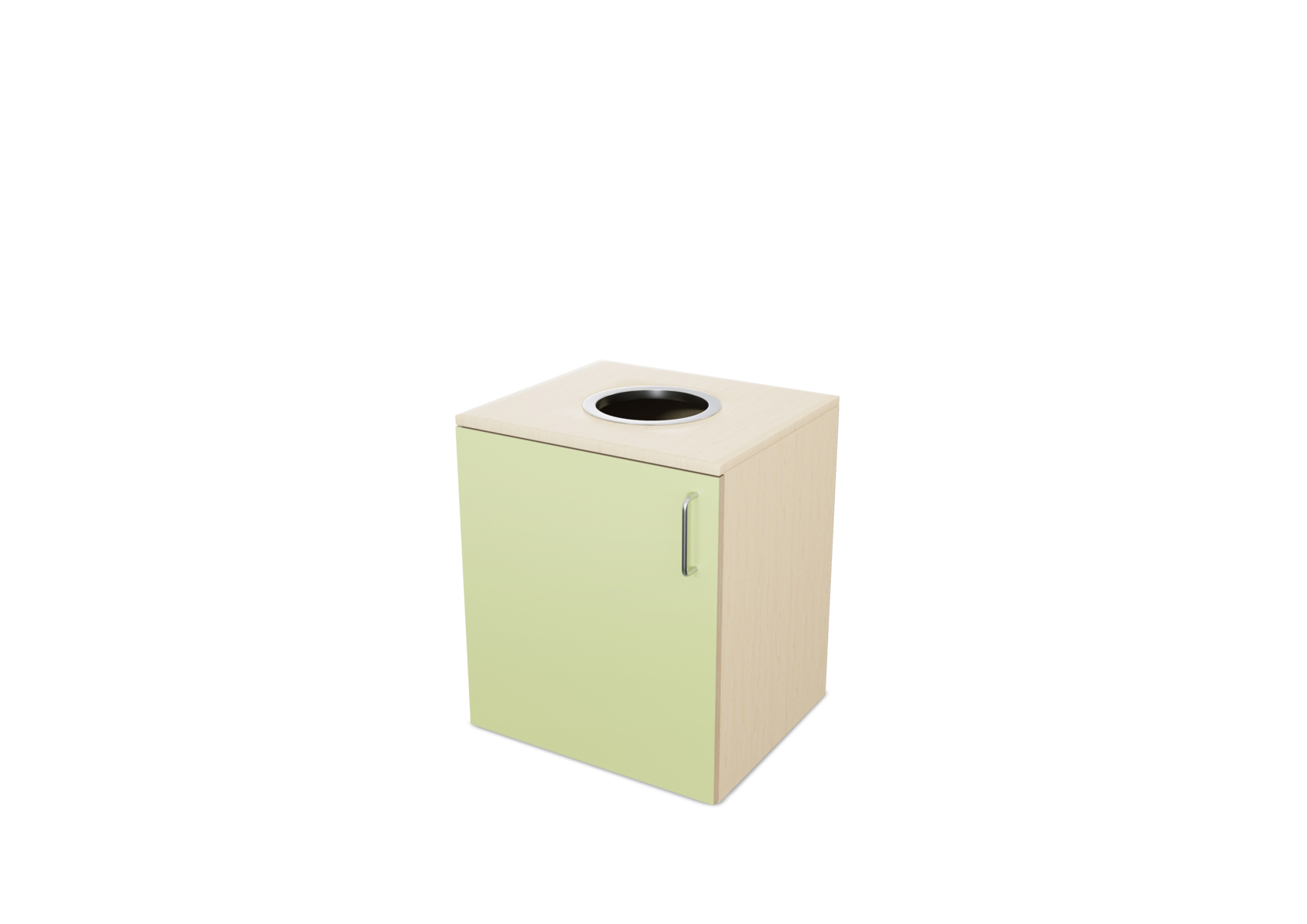 Miljöstation i laminat med dörr och handtag. Topplatta på stomme med hål i för avfall. Hålet har ø 20 cm. Välj mellan laminat och högtryckslaminat på dörr.
