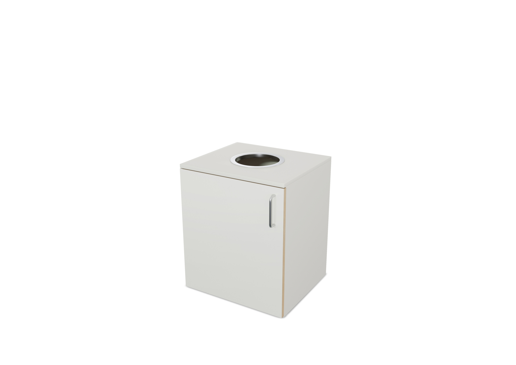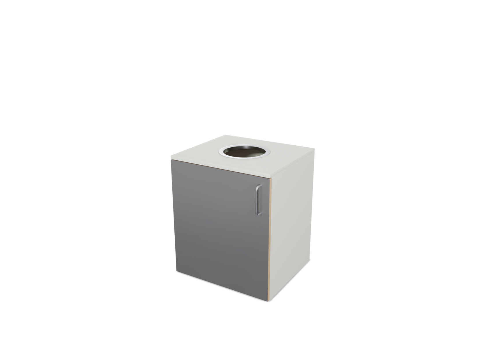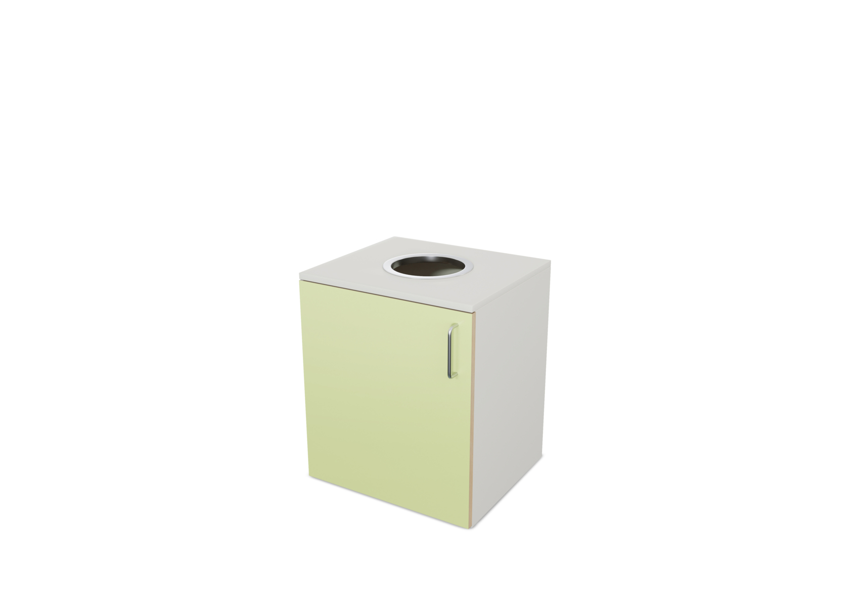 Miljöstation i laminat med dörr och handtag. Topplatta på stomme med hål i för avfall. Hålet har ø 20 cm. Välj mellan laminat och högtryckslaminat på dörr.