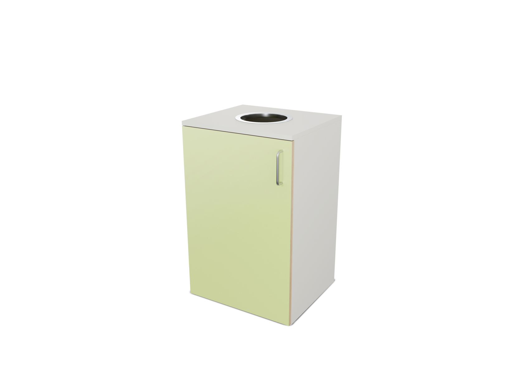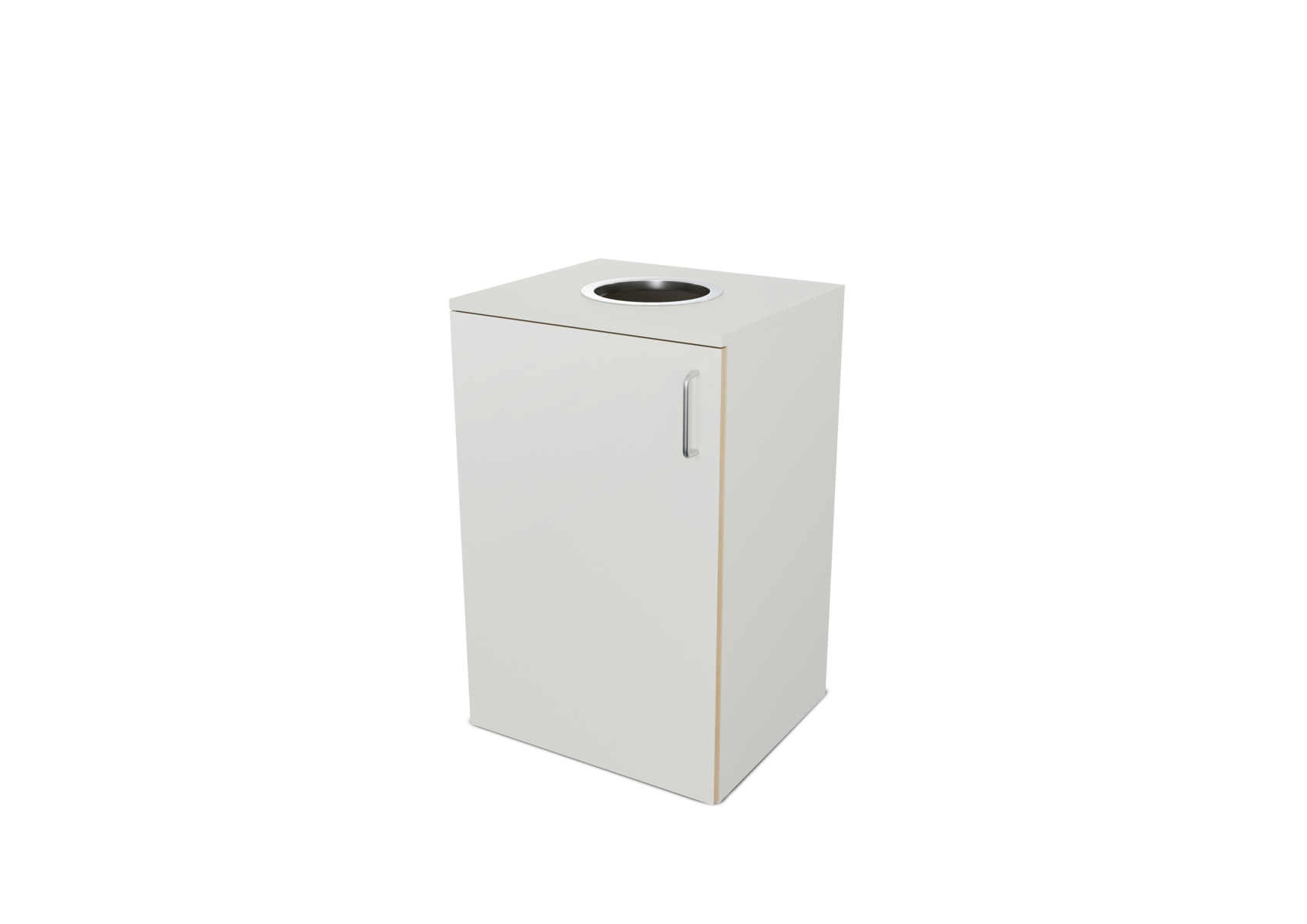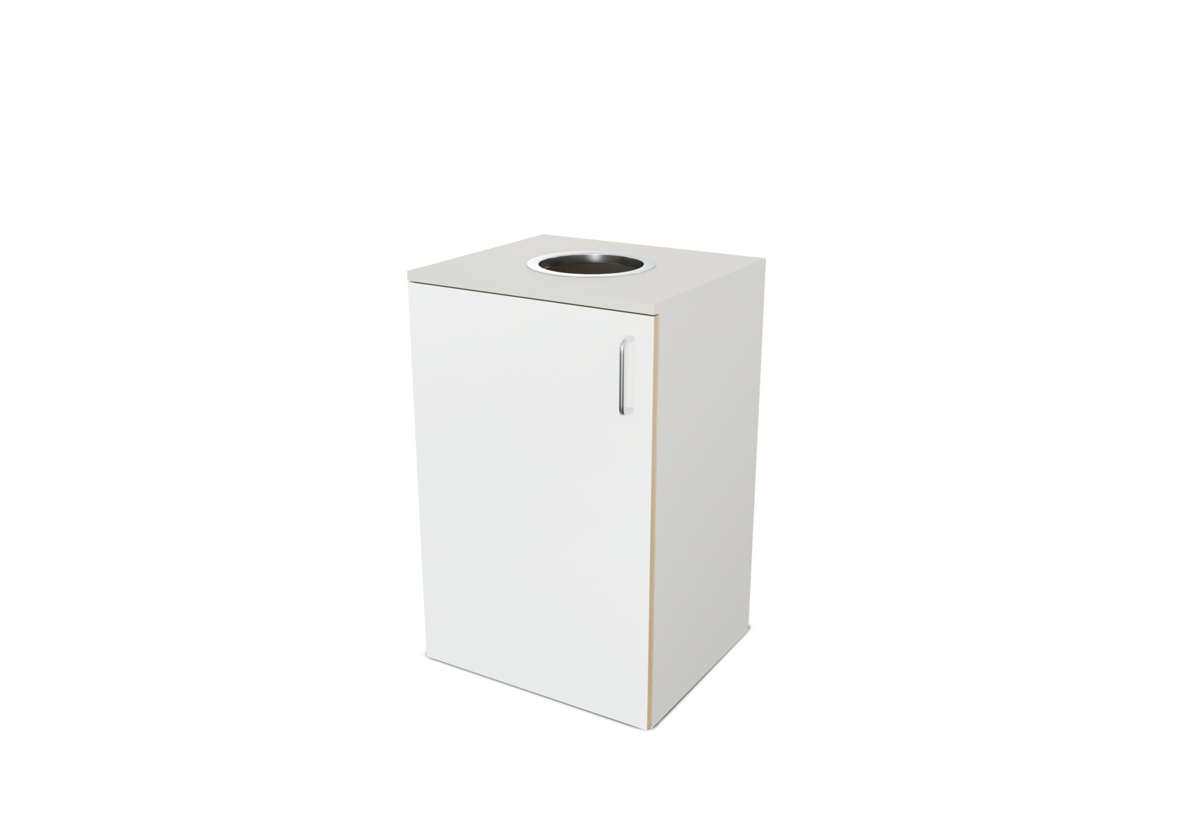 Miljöstation i laminat med dörr och handtag. Topplatta på stomme med hål i för avfall. Hålet har ø 20 cm. Välj mellan laminat och högtryckslaminat på dörr.