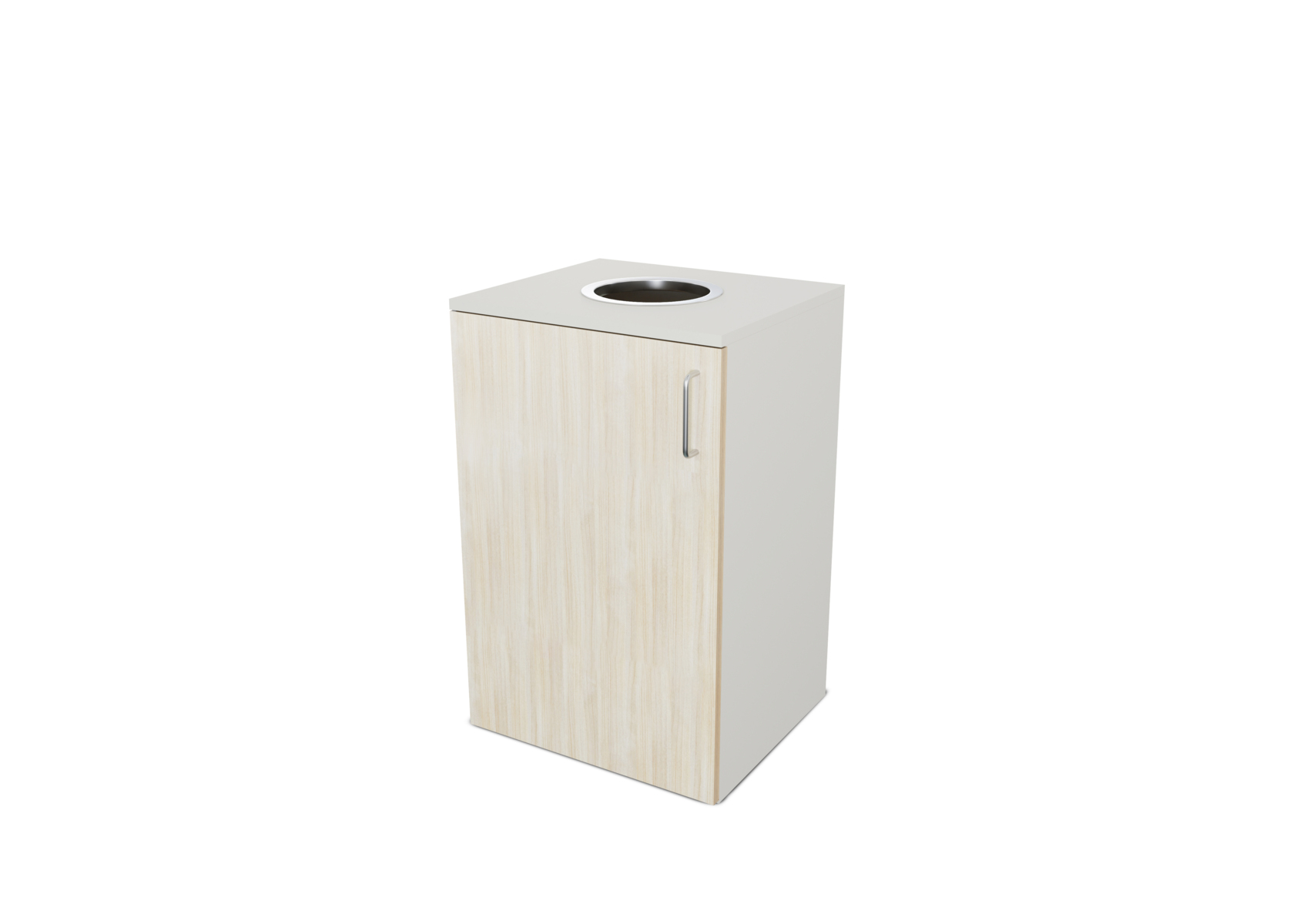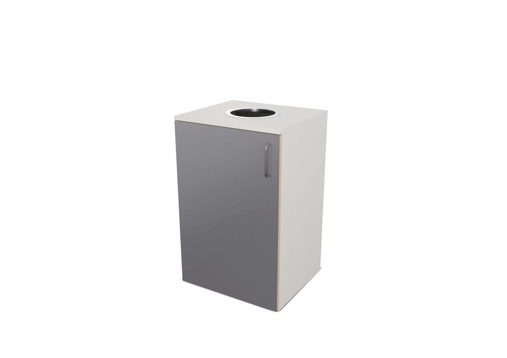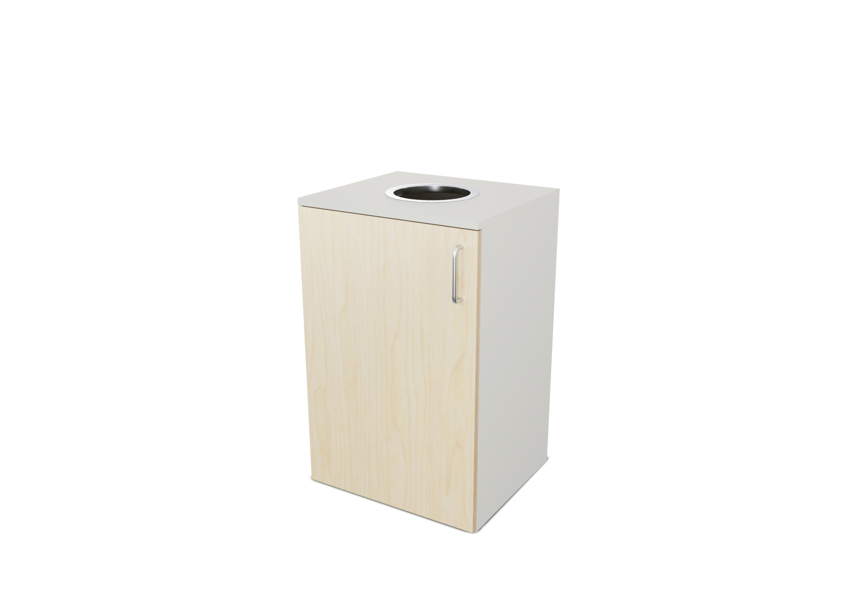 Miljöstation i laminat med dörr och handtag. Topplatta på stomme med hål i för avfall. Hålet har ø 20 cm. Välj mellan laminat och högtryckslaminat på dörr.