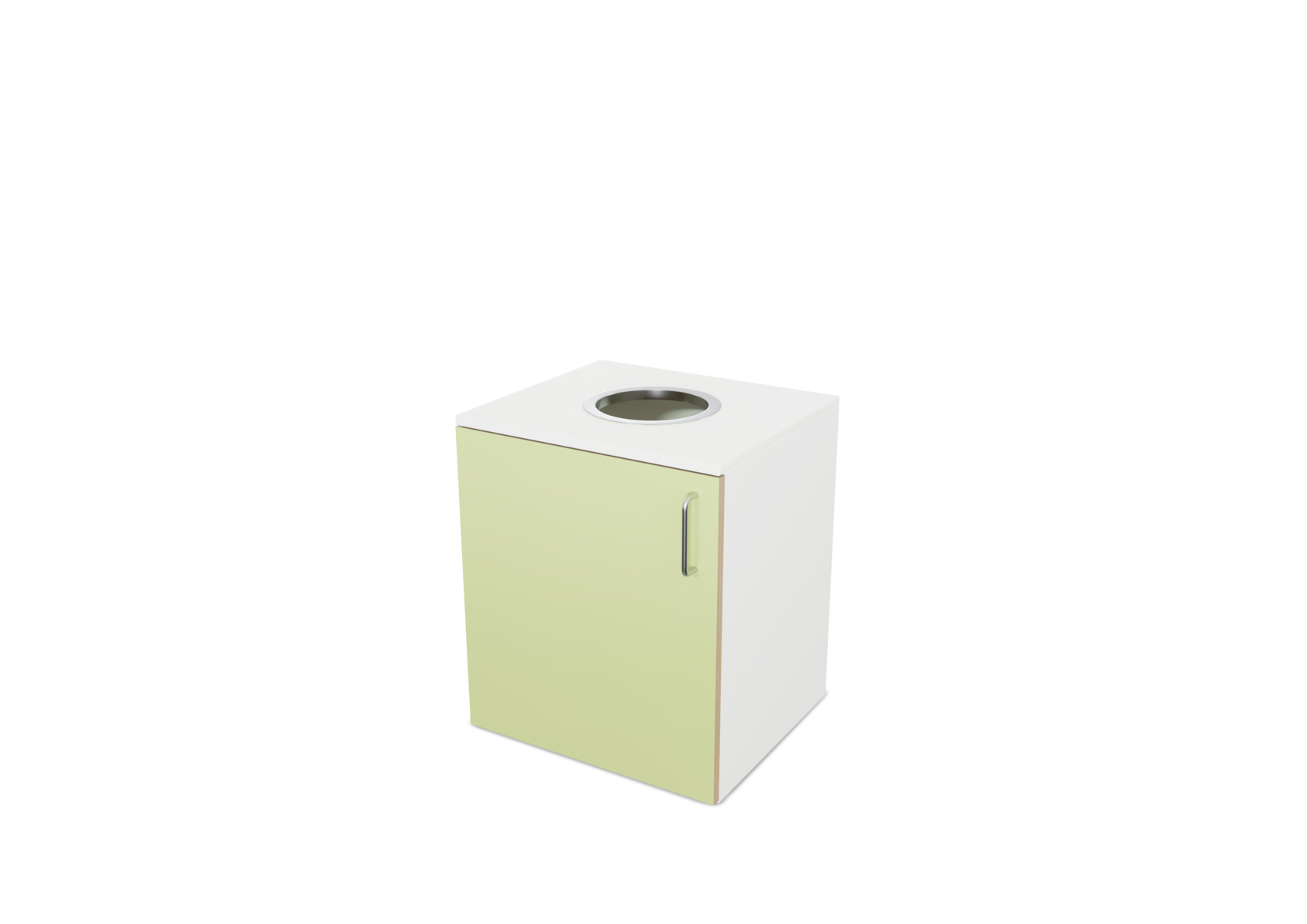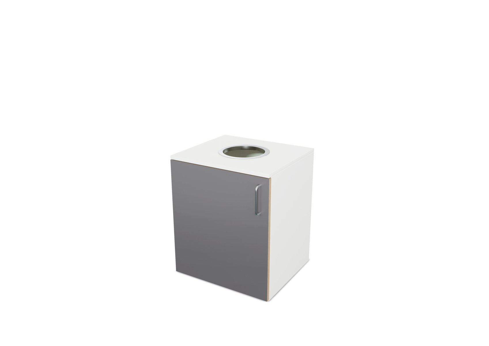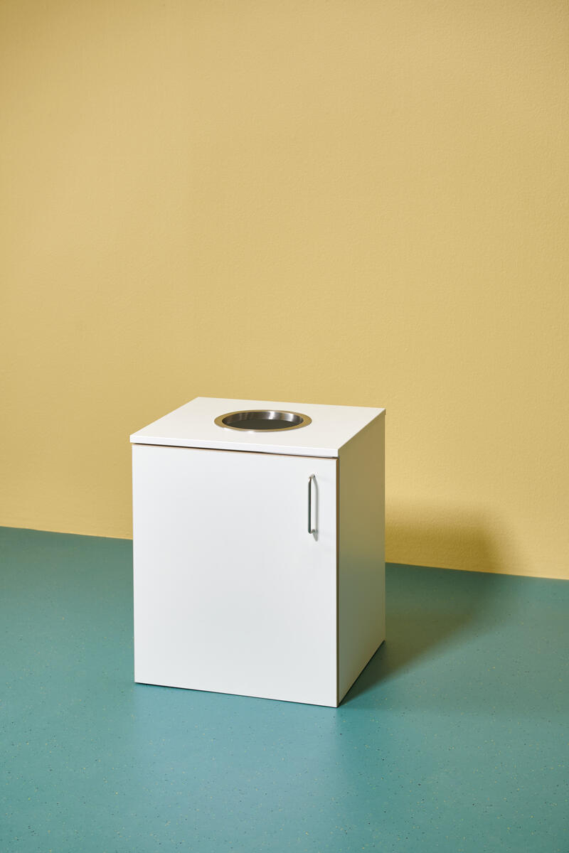 Miljöstation i laminat med dörr och handtag. Topplatta på stomme med hål i för avfall. Hålet har ø 20 cm. Välj mellan laminat och högtryckslaminat på dörr.