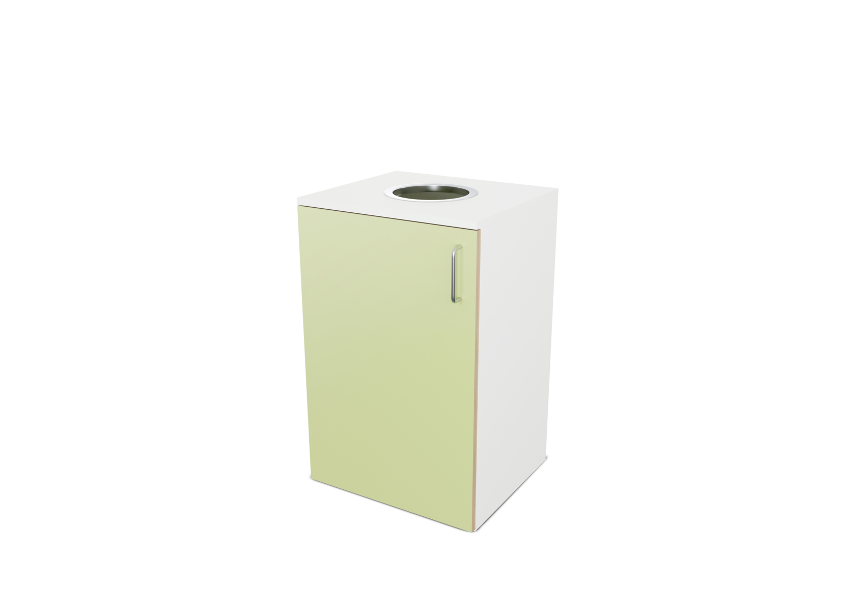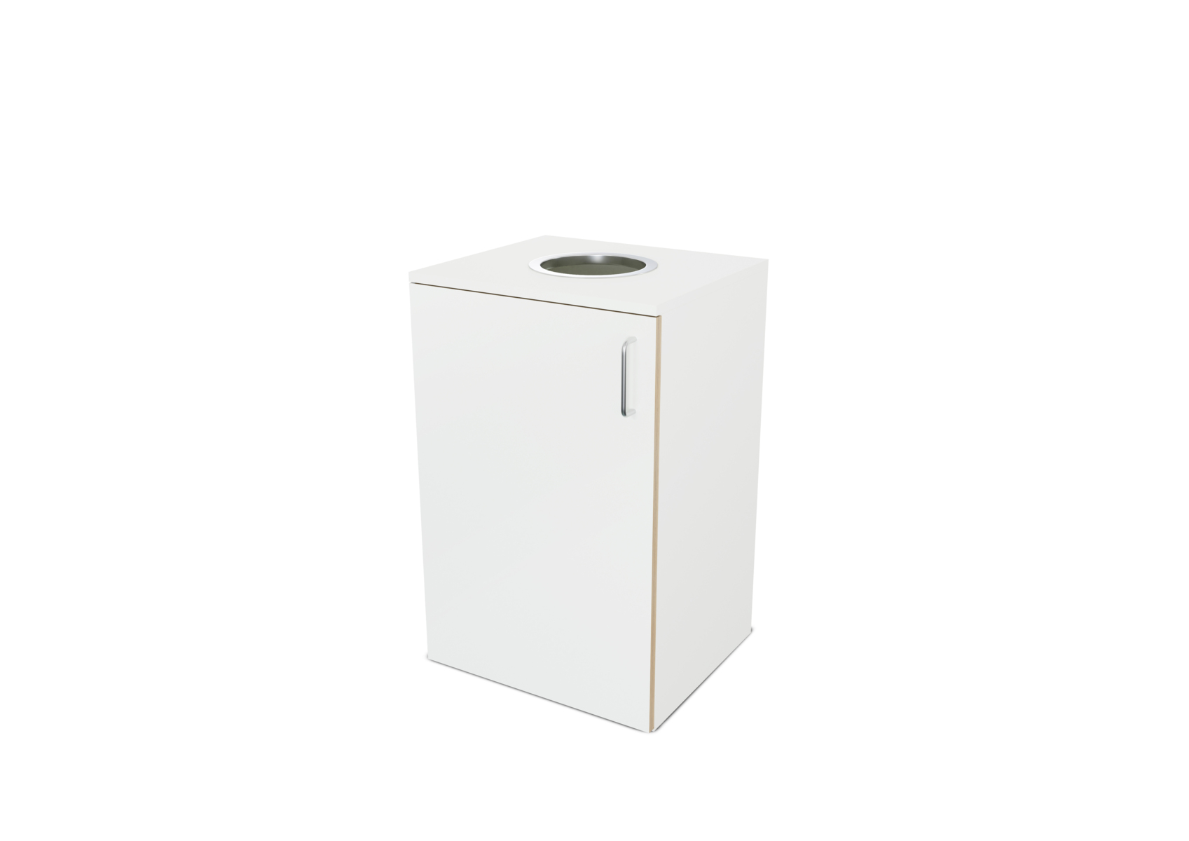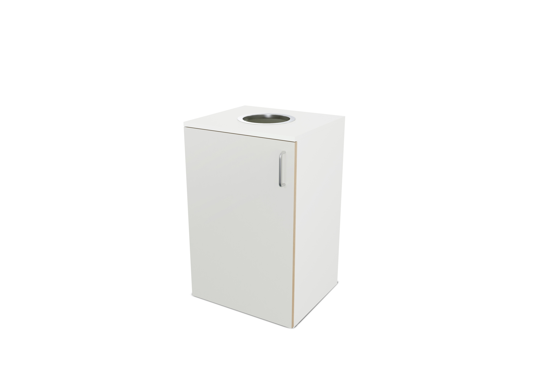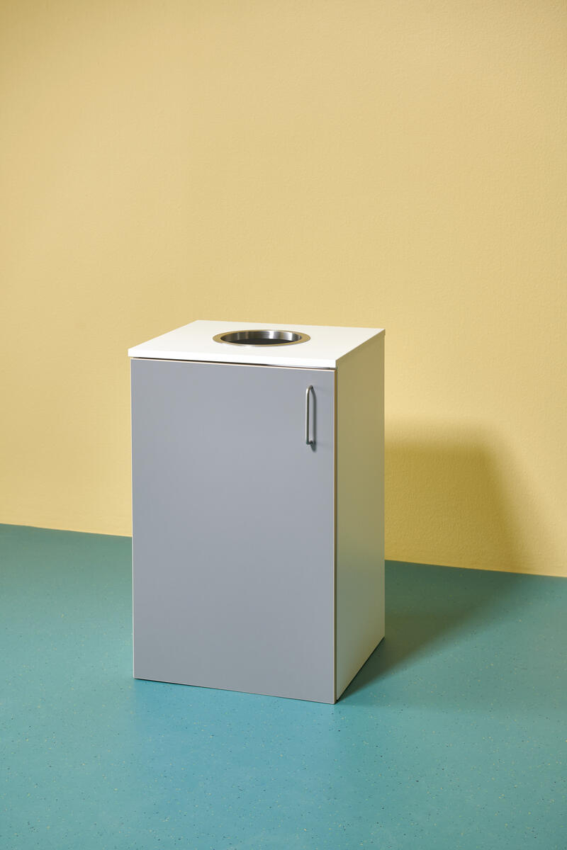 Miljöstation i laminat med dörr och handtag. Topplatta på stomme med hål i för avfall. Hålet har ø 20 cm. Välj mellan laminat och högtryckslaminat på dörr.