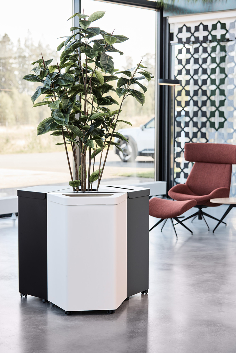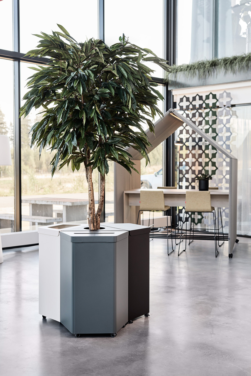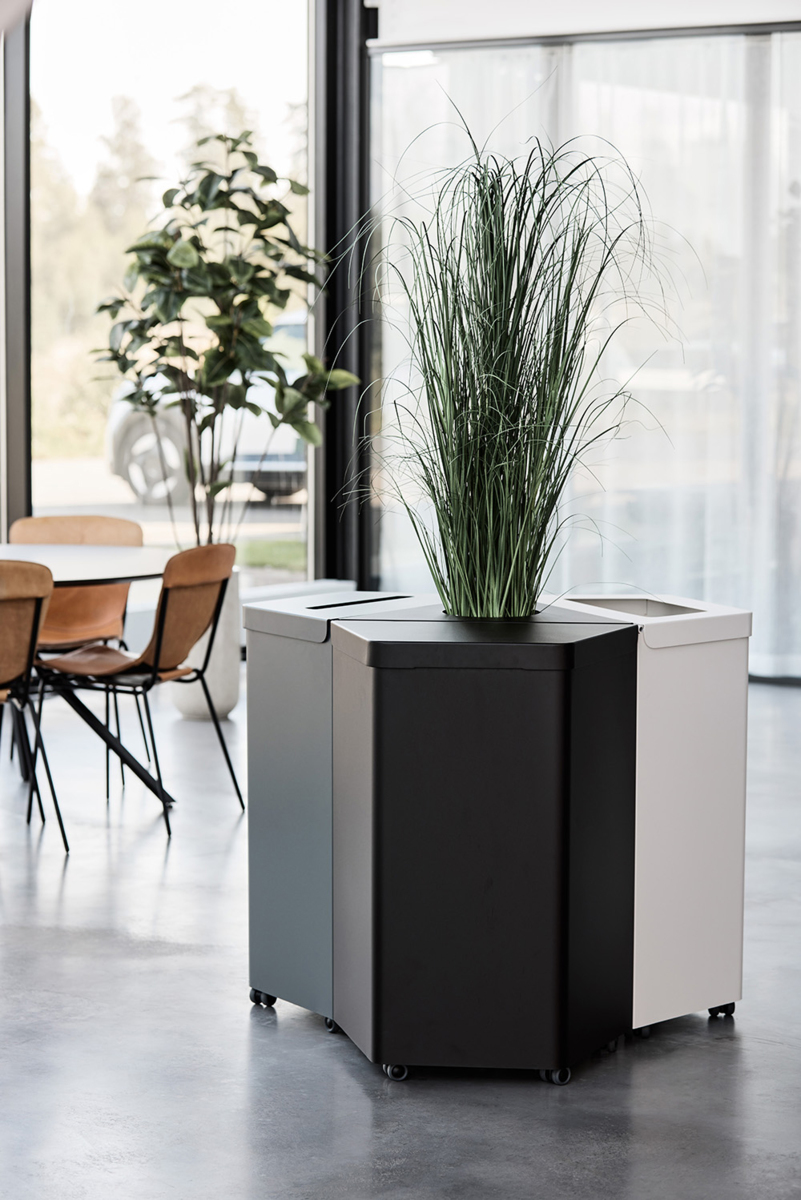 En flexibel återvinningsmodul i stålplåt som antingen monteras fristående, på vägg eller i en grupp om tre. Välj mellan ställbara fötter och låsbara hjul. Locken är utrustade med mjukstängande gångjärn. Anpassad för 125 l sopsäck. Dekal 18 cm (vit text/grå bakgrund) ingår. Vid sammansättning i grupp ihopkopplas modulerna med en mellantriangel och en toppskiva, antingen slät eller med hål för växt (dessa säljs separat).