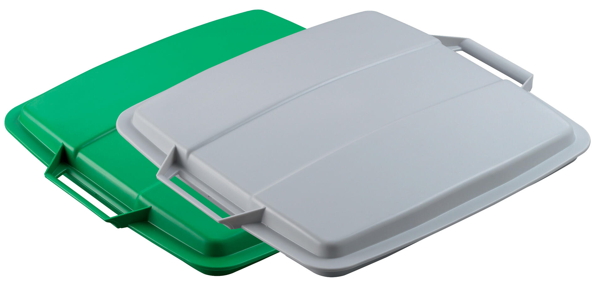 Plastlock till avfallstunna 60 l. Kläms enkelt fast på tunnan och sitter stadigt. Grönt: Med två runda hål för sortering av flaskor och burkar. Hela locket kan också fällas upp och stannar i upprätt läge. Grått: Fällbart lock. Stannar i upprätt läge som uppfällt. Svart: Helt lock.