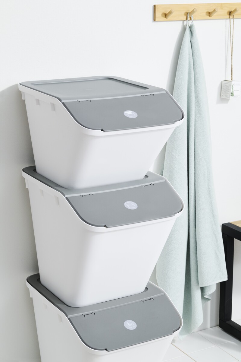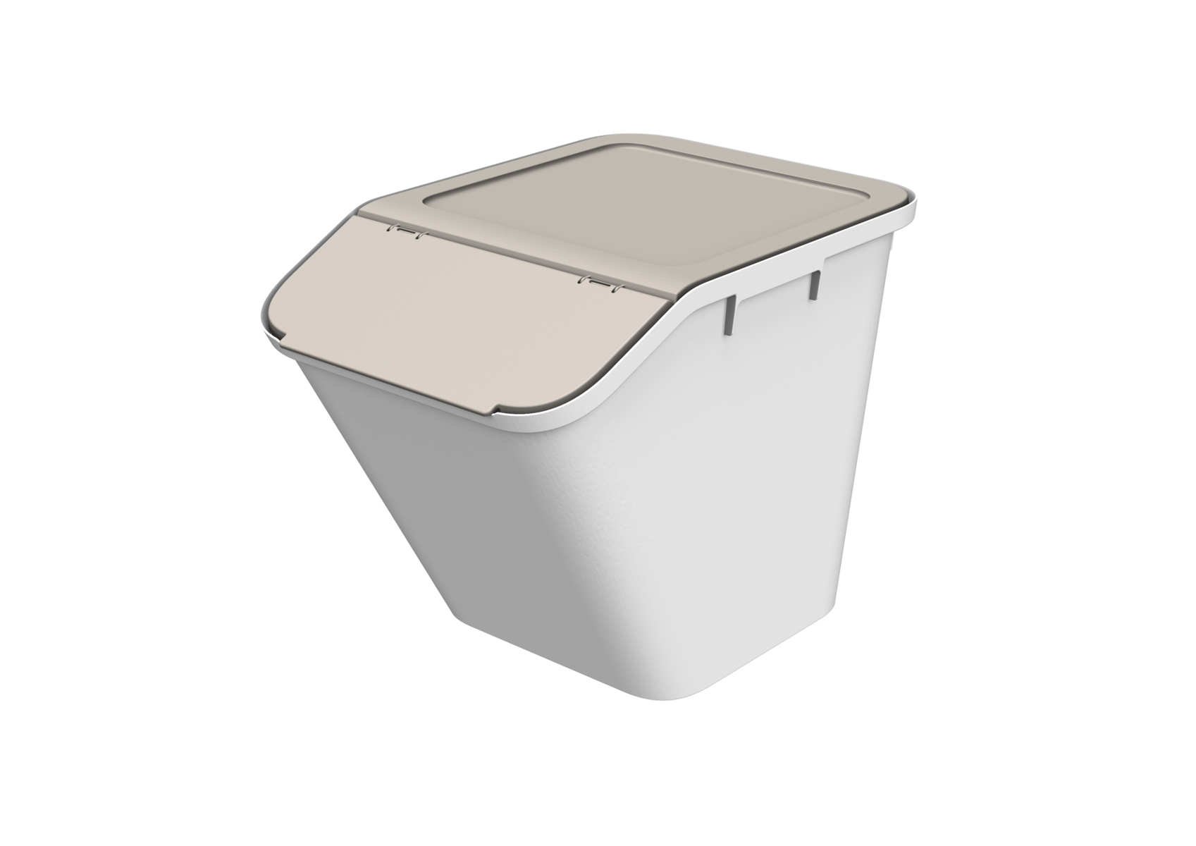 Stapelbart källsorteringskärl som gör det enkelt att sortera. Hållare på insidan håller påsen på plats. Tillverkad i Sverige av återvunnen plast. Mått: 55x39x42 cm.