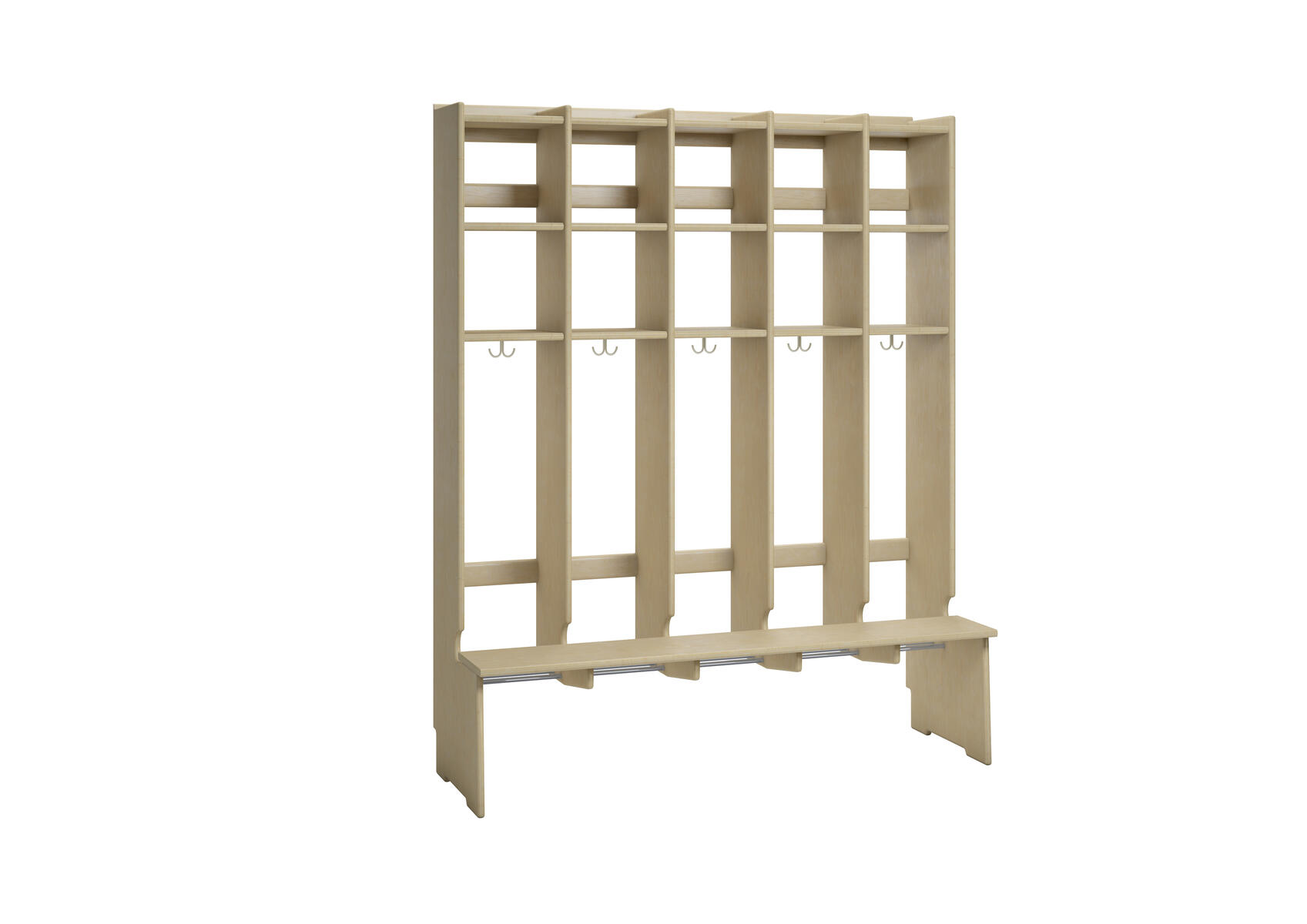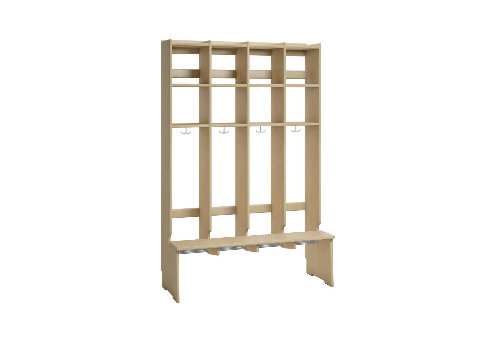 Flexiserien tillverkas i 18 mm björkkryssfaner. Skohylla med rör som släpper igenom smutsen från skor och stövlar. Dubbelkrok för kläd/väskkrok i varje fack. Luckor både uppe och nere kan väljas till i olika färger. Höjd: 168 cm. Djup 24 cm, vid sittbänk 44 cm. Med sittbänk och dubbla överskåp. Invändigt mått per plats 25 cm. Svanenmärkt, licensnummer 5031 0099.