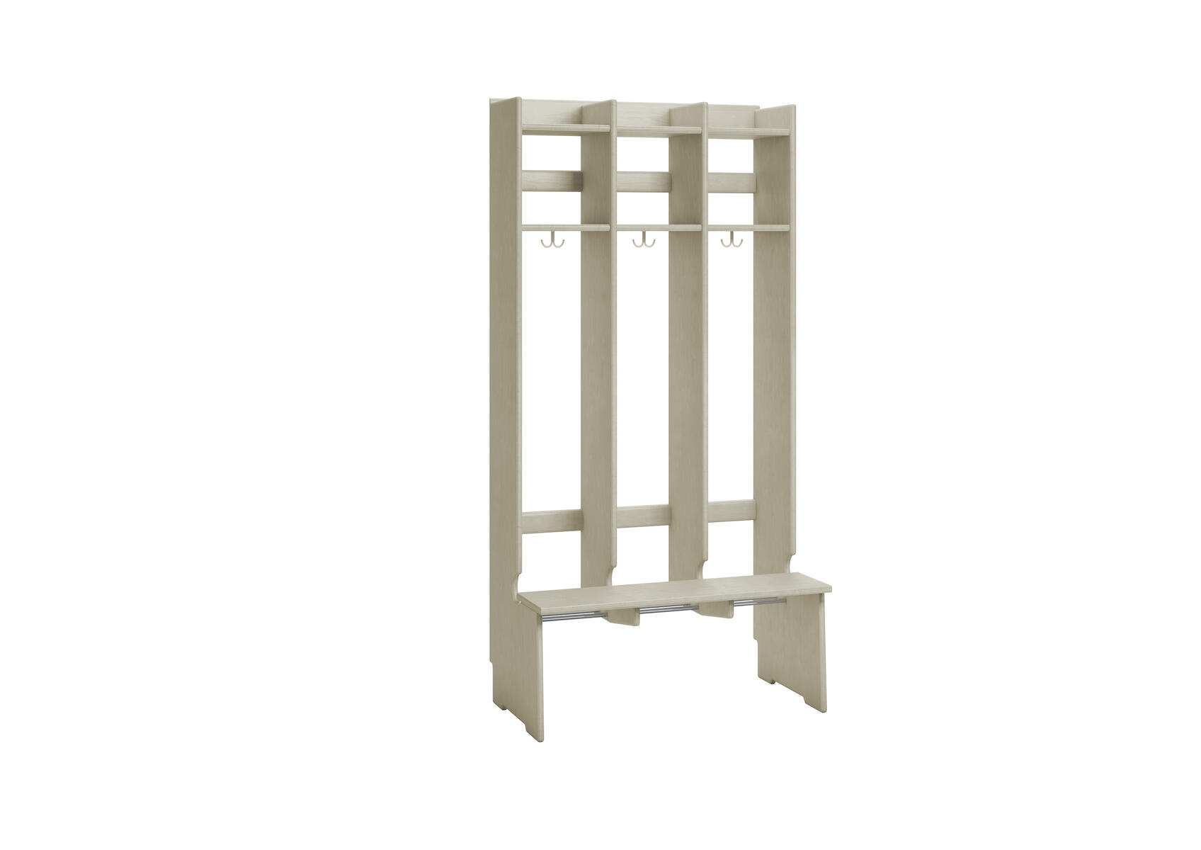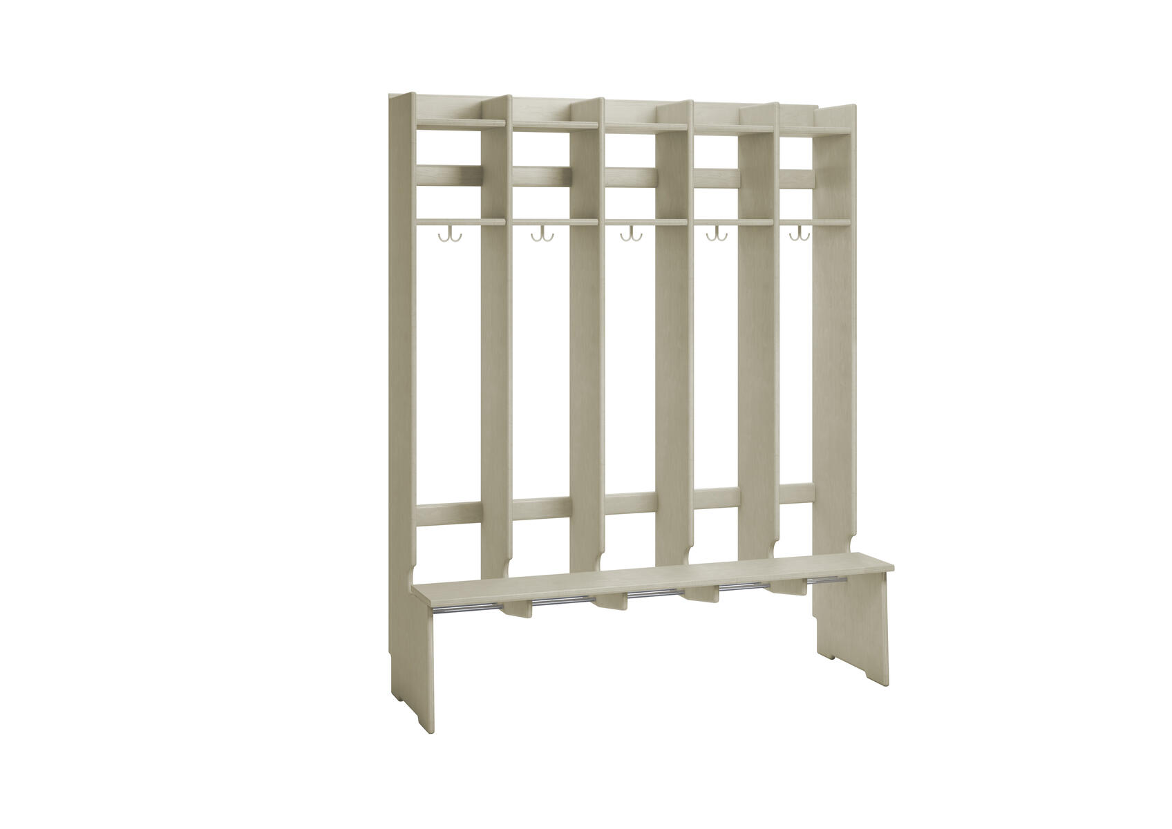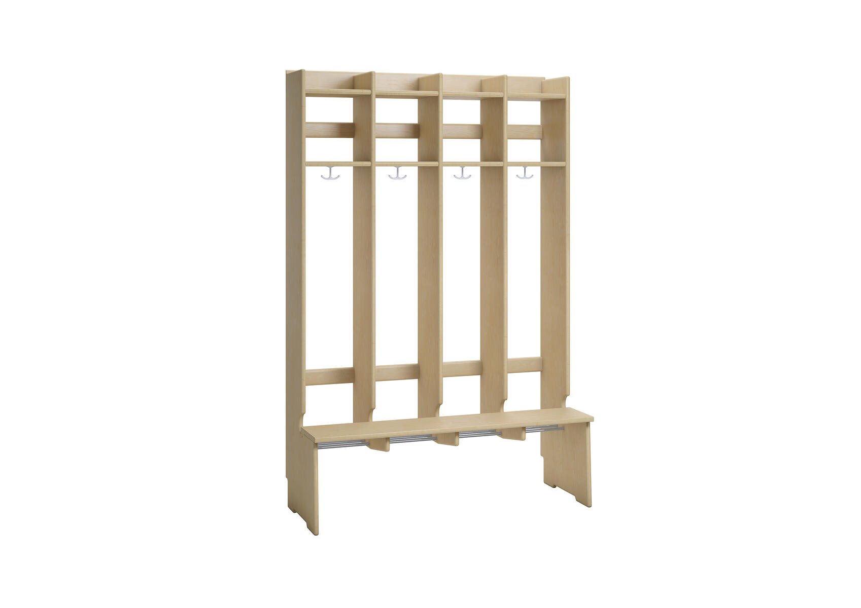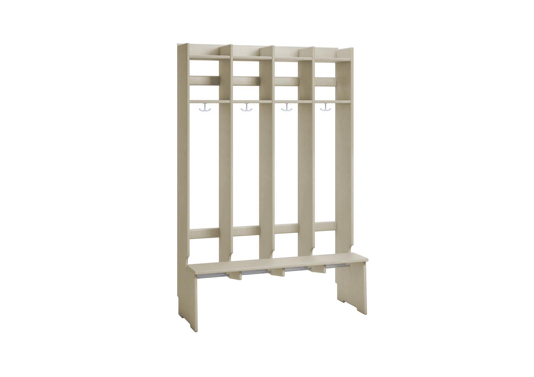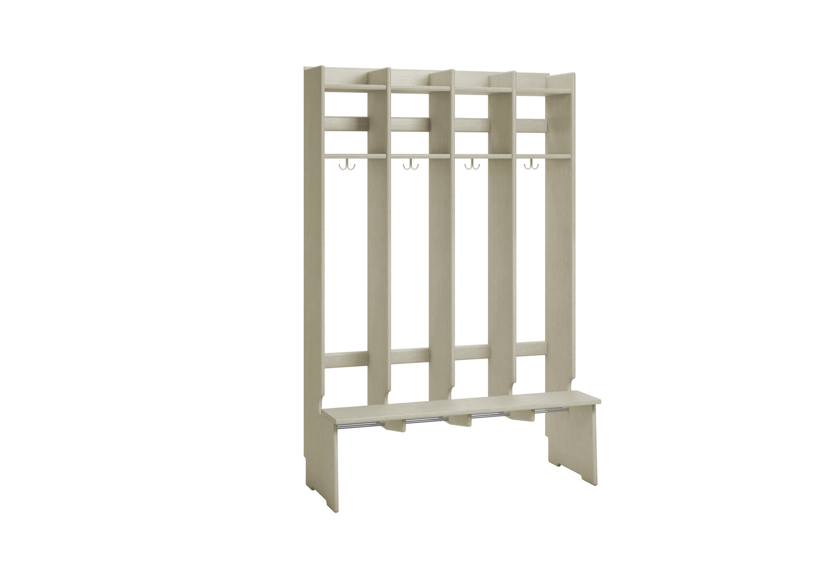 Flexiserien tillverkas i 18 mm björkkryssfaner. Skohylla med rör som släpper igenom smutsen från skor och stövlar. Dubbelkrok för kläd/väskkrok i varje fack. Luckor både uppe och nere kan väljas till i olika färger. Höjd: 168 cm. Djup 24 cm, vid sittbänk 44 cm. Med sittbänk och dubbla överskåp. Invändigt mått per plats 25 cm. Svanenmärkt, licensnummer 5031 0099.