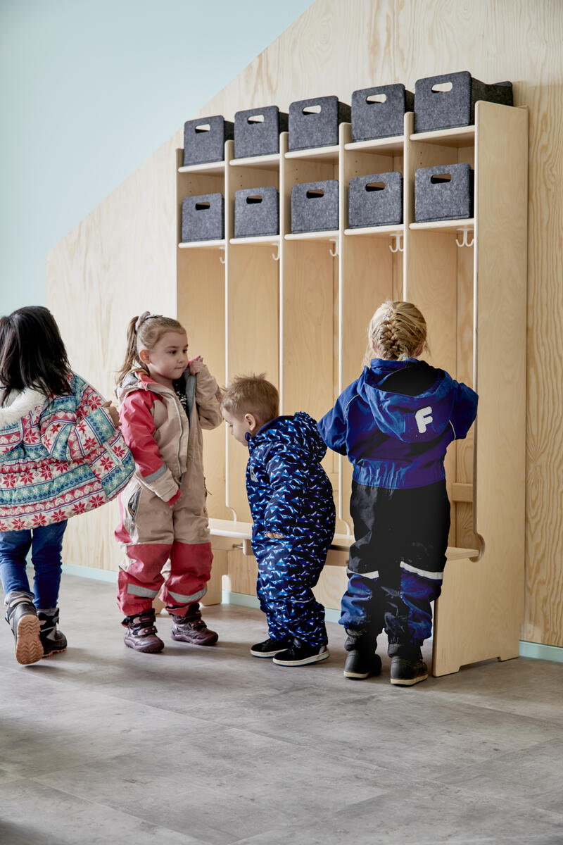 Flexiserien tillverkas i 18 mm björkkryssfaner. Skohylla med rör som släpper igenom smutsen från skor och stövlar. Dubbelkrok för kläd/väskkrok i varje fack. Luckor både uppe och nere kan väljas till i olika färger. Höjd: 165 cm. Djup 24 cm, vid sittbänk 44 cm. Med sittbänk och låsbara hjul. Levereras med rygg mellan sektionerna. Invändigt mått per plats 25 cm. Svanenmärkt, licensnummer 5031 0099.