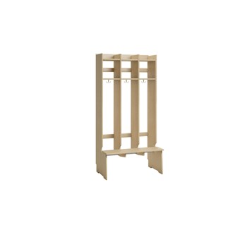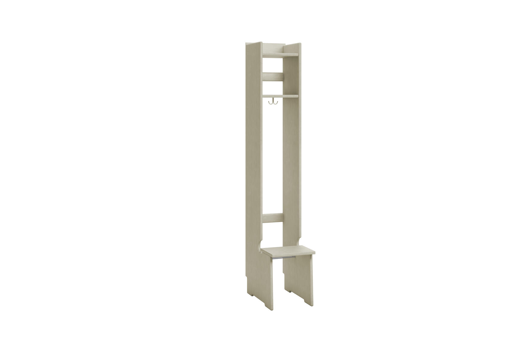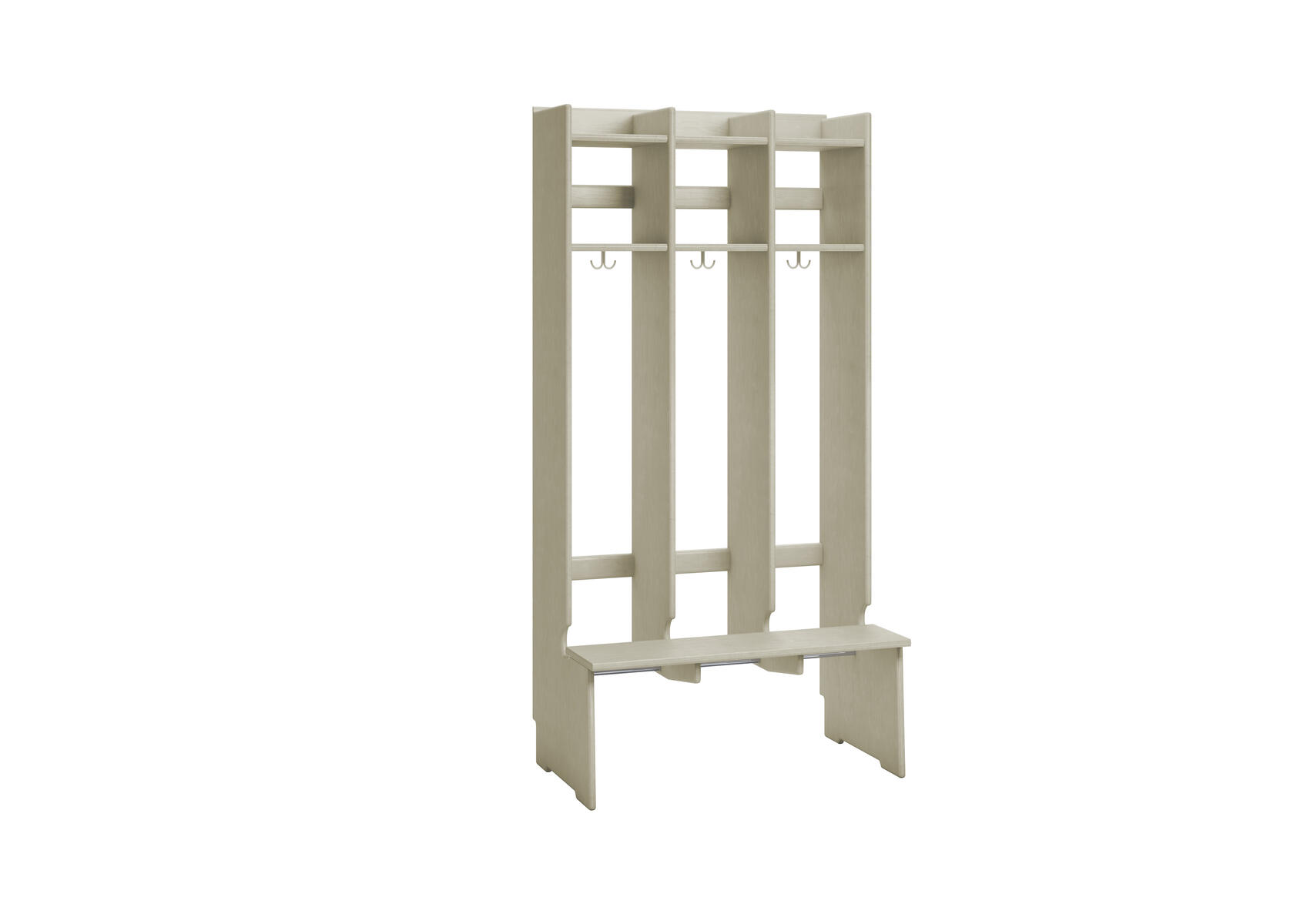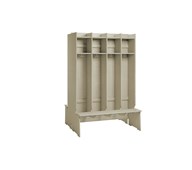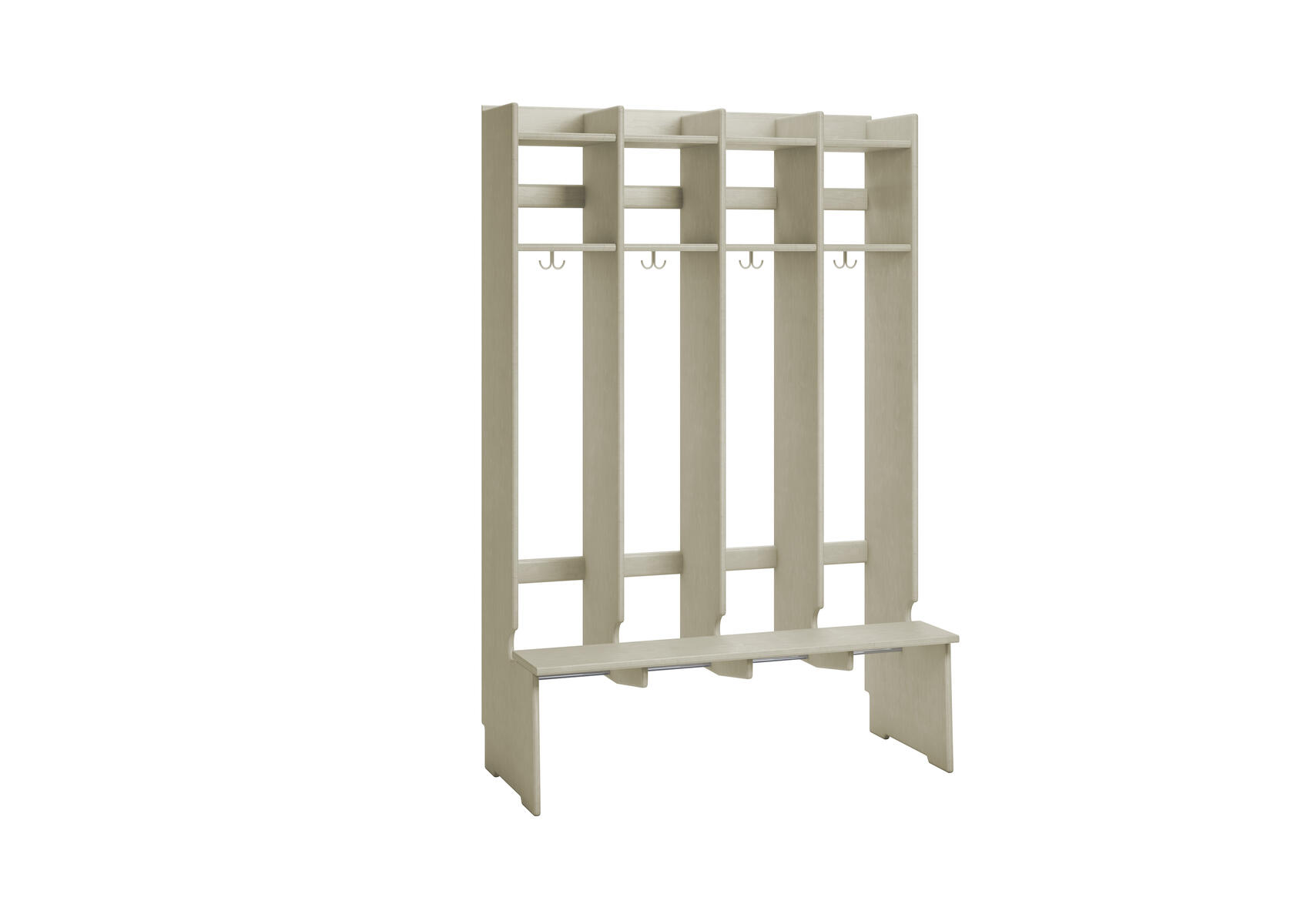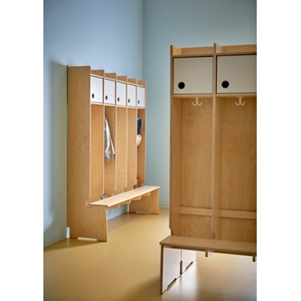 Flexiserien tillverkas i 18 mm björkkryssfaner. Skohylla med rör som släpper igenom smutsen från skor och stövlar. Dubbelkrok för kläd/väskkrok i varje fack. Luckor både uppe och nere kan väljas till i olika färger. Höjd: 168 cm. Djup 24 cm, vid sittbänk 44 cm. Med sittbänk och dubbla överskåp. Levereras med rygg mellan sektionerna. Invändigt mått per plats 28 cm. Svanenmärkt, licensnummer 5031 0099.