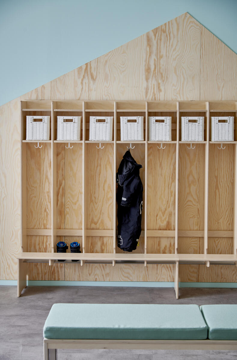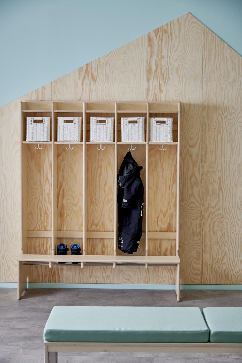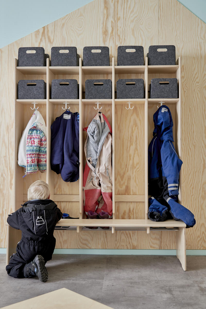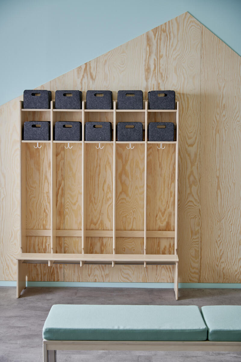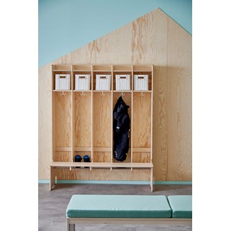 Flexiserien tillverkas i 18 mm björkkryssfaner. Skohylla med rör som släpper igenom smutsen från skor och stövlar. Dubbelkrok för kläd/väskkrok i varje fack. Luckor både uppe och nere kan väljas till i olika färger. Höjd: 168 cm. Djup 24 cm, vid sittbänk 44 cm. Med sittbänk. Levereras med rygg mellan sektionerna. Invändigt mått per plats 28 cm. Svanenmärkt, licensnummer 5031 0099.