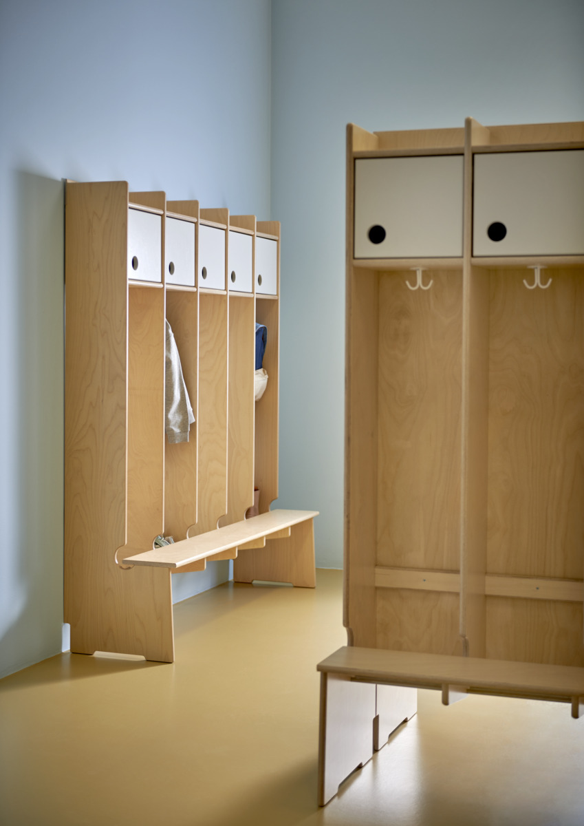 Flexiserien tillverkas i 18 mm björkkryssfaner. Skohylla med rör som släpper igenom smutsen från skor och stövlar. Dubbelkrok för kläd/väskkrok i varje fack. Luckor både uppe och nere kan väljas till i olika färger. Höjd: 168 cm. Djup 24 cm, vid sittbänk 44 cm. Med sittbänk och dubbla överskåp. Invändigt mått per plats 28 cm. Svanenmärkt, licensnummer 5031 0099.