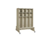 Flexiserien tillverkas i 18 mm björkkryssfaner. Skohylla med rör som släpper igenom smutsen från skor och stövlar. Dubbelkrok för kläd/väskkrok i varje fack. Luckor både uppe och nere kan väljas till i olika färger. Höjd: 165 cm. Djup 24 cm, vid sittbänk 44 cm. Med sittbänk och låsbara hjul. Levereras med rygg mellan sektionerna. Invändigt mått per plats 28 cm. Svanenmärkt, licensnummer 5031 0099.