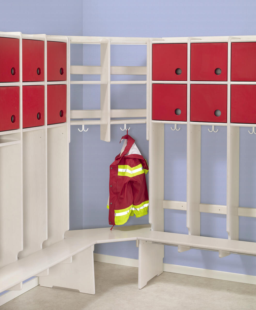 Flexiserien tillverkas i 18 mm björkkryssfaner. Skohylla med rör som släpper igenom smutsen från skor och stövlar. Dubbelkrok för kläd/väskkrok i varje fack. Luckor både uppe och nere kan väljas till i olika färger. Höjd: 143 cm. Djup 24 cm, vid sittbänk 44 cm. Avstånd från klädkrok till skohylla: 100 cm. Vägghängd med sittbänk. Invändigt mått per plats 28 cm. Svanenmärkt, licensnummer 5031 0099.