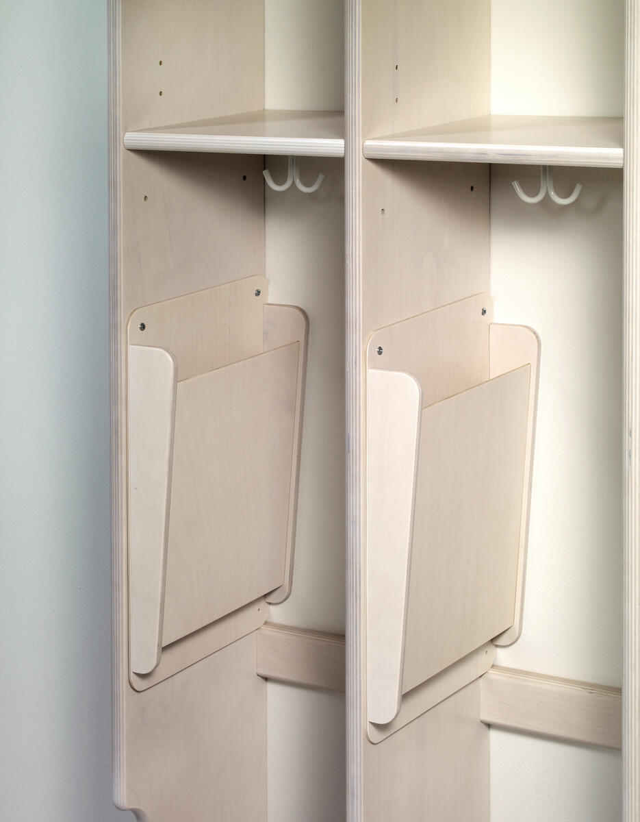 Flexiserien tillverkas i 18 mm björkkryssfaner. Hatthylla som kan kombineras med separat sittbänk och skohylla. Dubbelkrok för kläd/väskkrok i varje fack. Luckor kan väljas till i olika färger. Invändigt mått per plats 28 cm. Svanenmärkt, licensnummer 5031 0099.