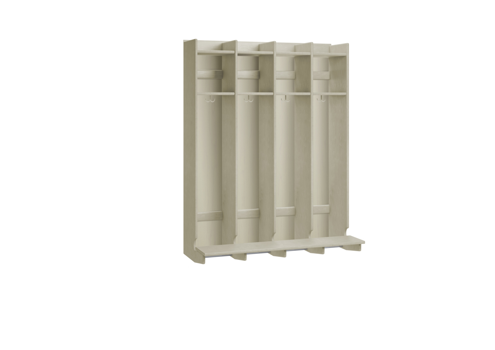 Flexiserien tillverkas i 18 mm björkkryssfaner. Skohylla med rör som släpper igenom smutsen från skor och stövlar. Dubbelkrok för kläd/väskkrok i varje fack. Luckor både uppe och nere kan väljas till i olika färger. Höjd: 143 cm. Djup 24 cm, vid sittbänk 44 cm. Avstånd från klädkrok till skohylla: 100 cm. Vägghängd med sittbänk. Invändigt mått per plats 22 cm. Svanenmärkt, licensnummer 5031 0099.