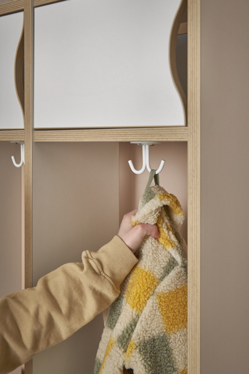 Modul med bänk och skohylla. Väggförankras. Sittbänkens djup 24 cm. Av 18 mm spånskiva med laminat. Med dubbelkrok, plastfötter och kantlist i plywoodlook. Vänsterhängd dörr kan köpas.