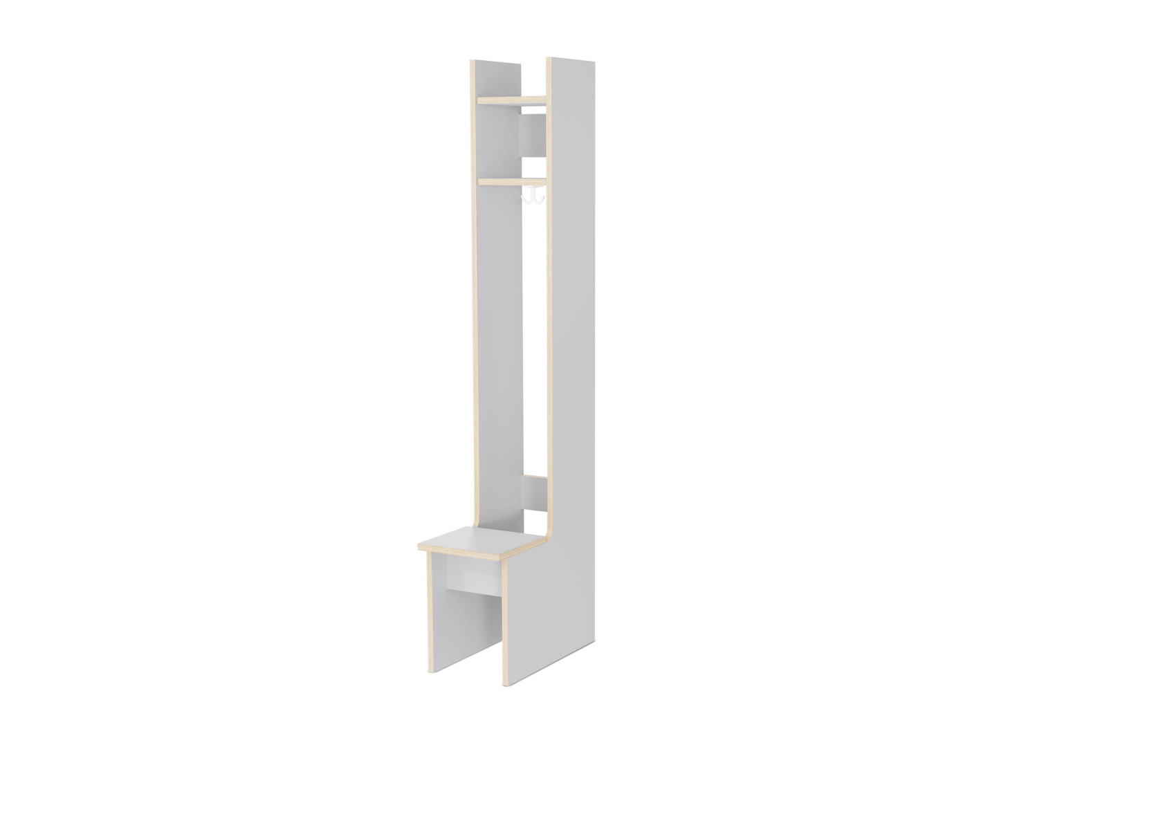 Modul med bänk och skohylla. Väggförankras. Sittbänkens djup 24 cm. Av 18 mm spånskiva med laminat. Med dubbelkrok, plastfötter och kantlist i plywoodlook. Vänsterhängd dörr kan köpas.