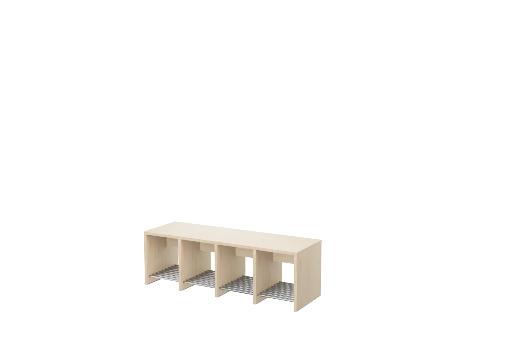 Modul med bänk och skohylla. Väggförankras. Sittbänkens djup 24 cm. Av 18 mm spånskiva med laminat. Med dubbelkrok, plastfötter och kantlist i plywoodlook. Vänsterhängd dörr kan köpas.