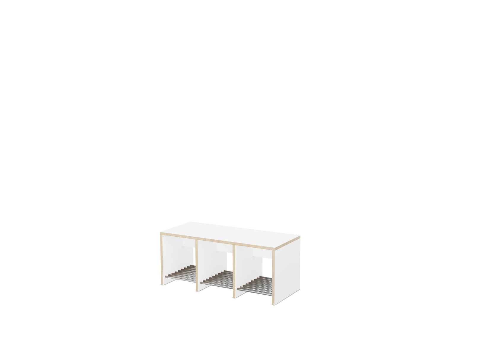 Bänk med skohylla/stålrör. Av 18 mm spånskiva med laminat. Med plastfötter och kantlist i plywoodlook.