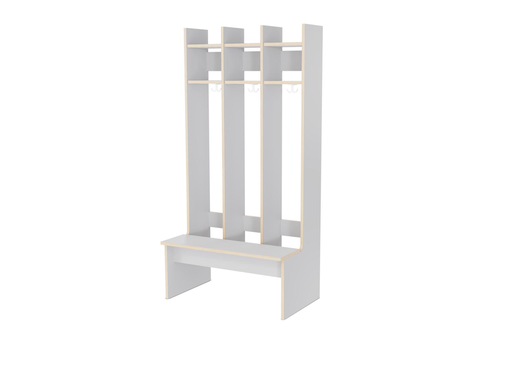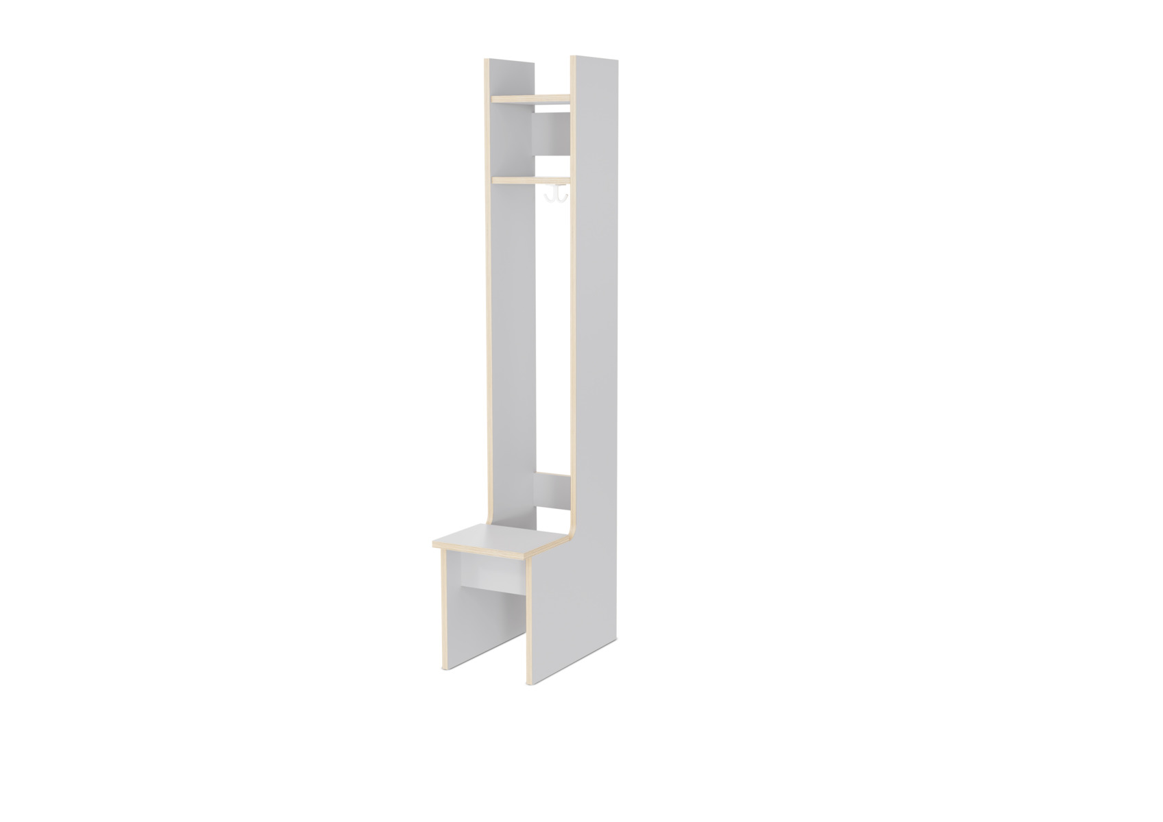 Modul med bänk och skohylla. Väggförankras. Sittbänkens djup 24 cm. Av 18 mm spånskiva med laminat. Med dubbelkrok, plastfötter och kantlist i plywoodlook. Vänsterhängd dörr kan köpas.