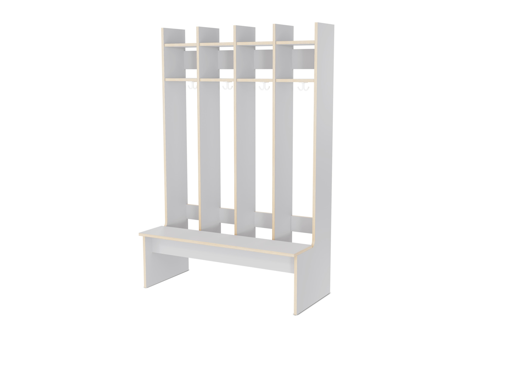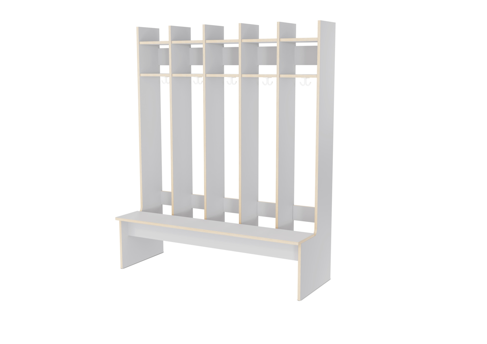 Flexiserien tillverkas i 18 mm björkkryssfaner. Skohylla med rör som släpper igenom smutsen från skor och stövlar. Dubbelkrok för kläd/väskkrok i varje fack. Luckor både uppe och nere kan väljas till i olika färger. Höjd: 168 cm. Djup 24 cm, vid sittbänk 44 cm. Med sittbänk och dubbla överskåp. Invändigt mått per plats 25 cm. Svanenmärkt, licensnummer 5031 0099.