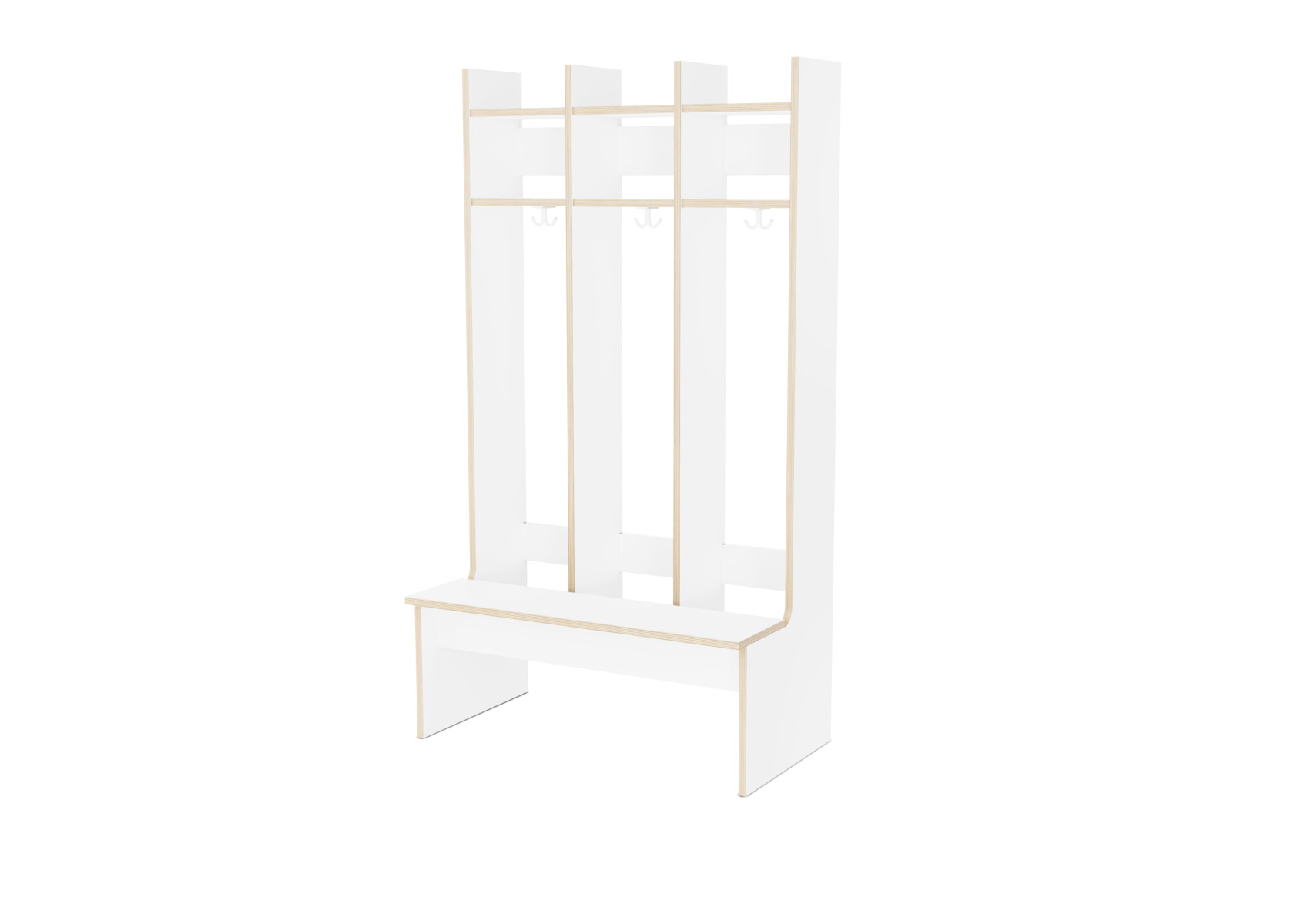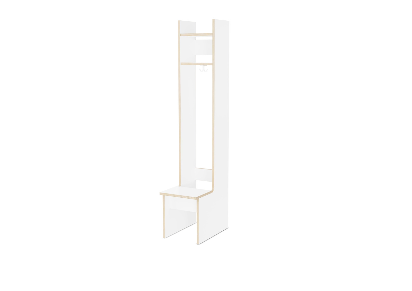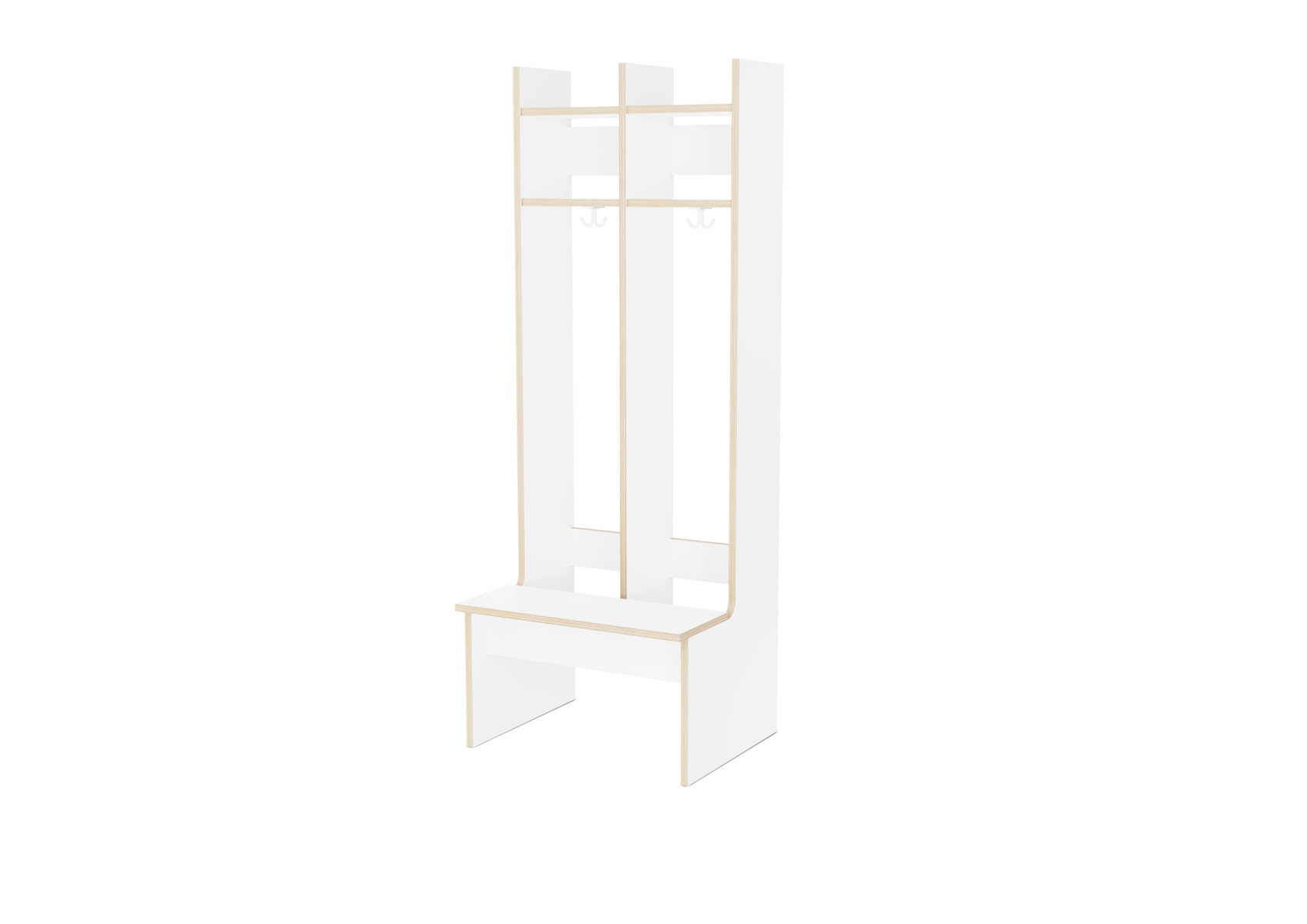 Modul med bänk och skohylla. Väggförankras. Sittbänkens djup 24 cm. Av 18 mm spånskiva med laminat. Med dubbelkrok, plastfötter och kantlist i plywoodlook. Vänsterhängd dörr kan köpas.