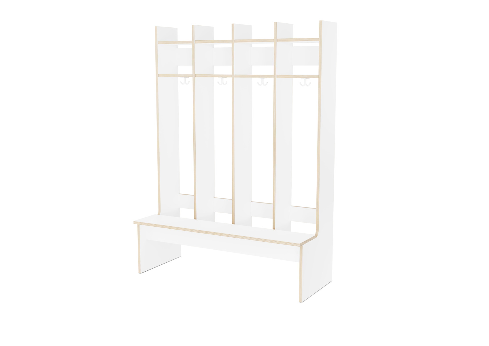 Flexiserien tillverkas i 18 mm björkkryssfaner. Skohylla med rör som släpper igenom smutsen från skor och stövlar. Dubbelkrok för kläd/väskkrok i varje fack. Luckor både uppe och nere kan väljas till i olika färger. Höjd: 168 cm. Djup 24 cm, vid sittbänk 44 cm. Med sittbänk och dubbla överskåp. Invändigt mått per plats 25 cm. Svanenmärkt, licensnummer 5031 0099.