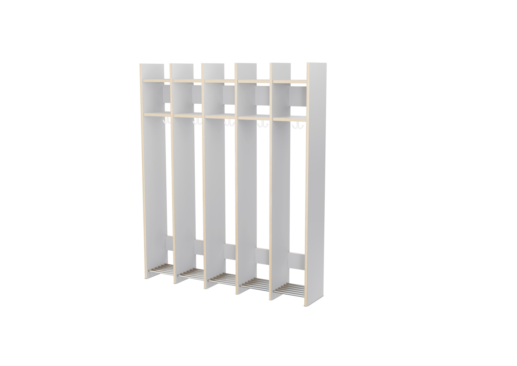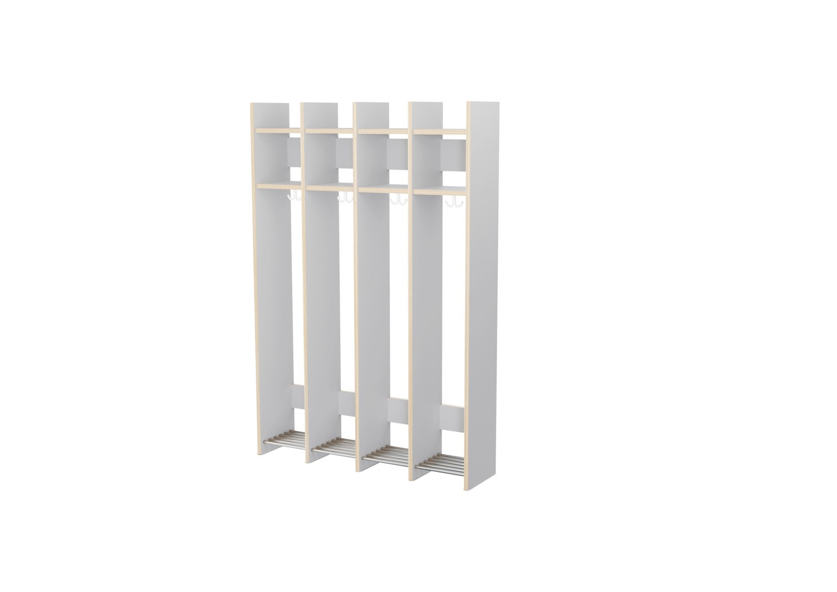 Flexiserien tillverkas i vitpigmenterad 18 mm björkkryssfaner. Skohylla med rör som släpper igenom smutsen från skor och stövlar. Dubbelkrok för kläd/väskkrok i varje fack. Luckor både uppe och nere kan väljas till i olika färger. Kan kombineras med separat klädfack. Invändigt mått per plats 28 cm. Svanenmärkt, licensnummer 5031 0099.