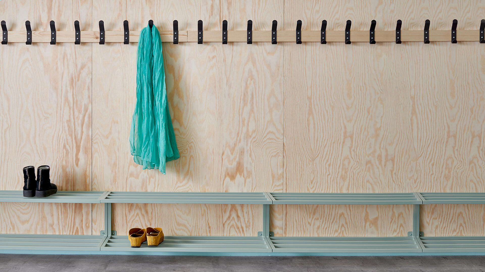 Hatt- och skohylla i samma enhet. Använd samma del både uppe och nere. Monteras direkt på vägg. Bredd 99 cm. Stål, torka med fuktig trasa. Komplettera med Walter krok 82042 som hakas på stången och skruvas fast.