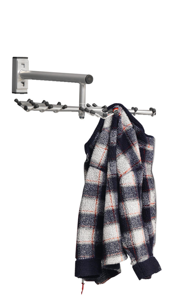 30 krokar. 5 armar. 2 st väggfästen medföljer vilket gör klädvindan enkel att flytta för t.ex. torkning av kläder inomhus eller utomhus. Max belastning 30 kg. Lackerad i silver, RAL 9006. Mått: B48xD55.
